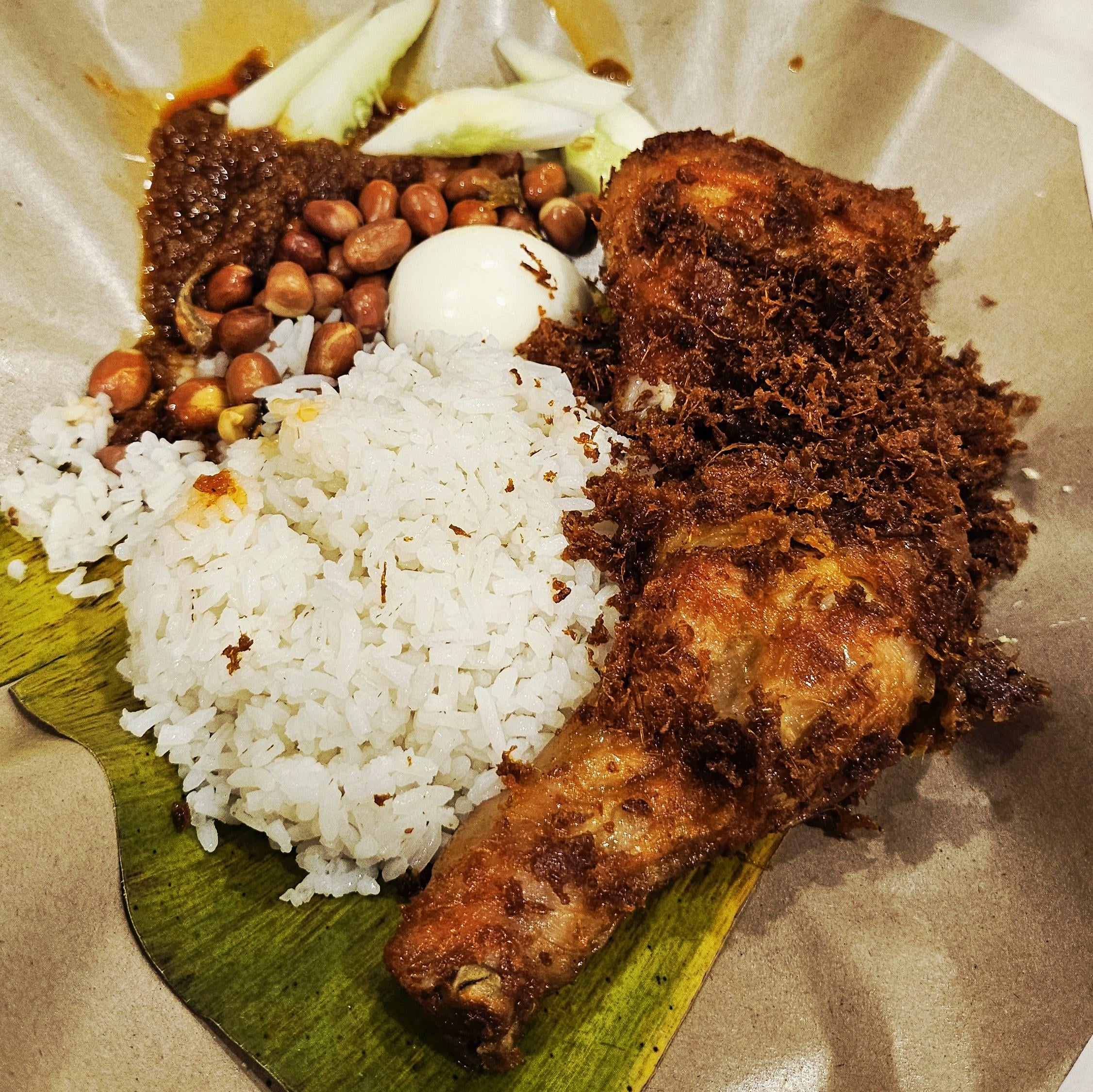 [I ate] Nasi lemak aka fragrant rice cooked in coconut milk and pandan leaves with spiced fried chicken, fried anchovies, roasted peanuts, boiled egg and fresh cucumbers (Village Park Restaurant, KL)
