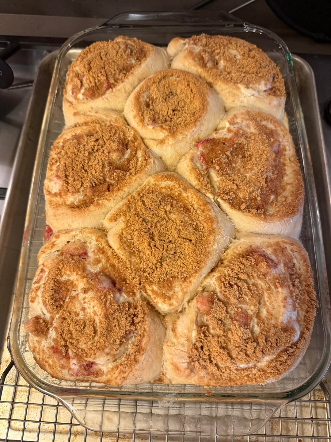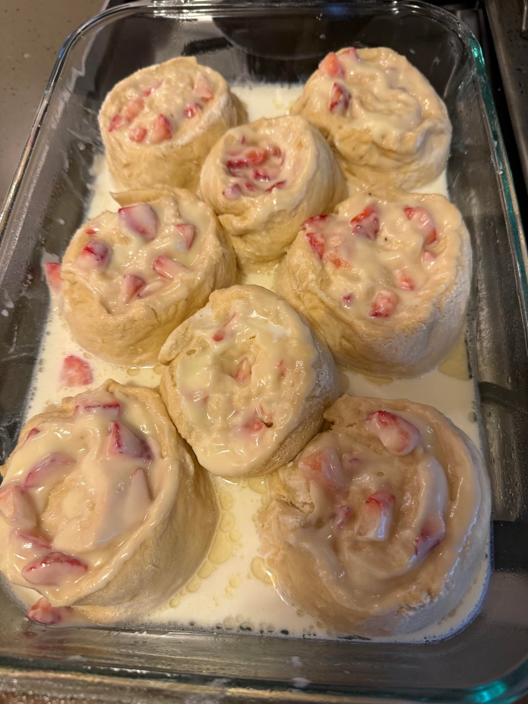 real cheesecake filling, fresh strawberries, and the dough has some strawberries blended and strained in it. i stay away from red food coloring and I was hoping the strawberries would give it some color but alas, they’re pale pink in the right lighting lol. but the strawberry flavor is there, and the cheesecake flavor is there, and they were so soft! if anyone wants the recipe I took it from like two different recipes and added my own twists
