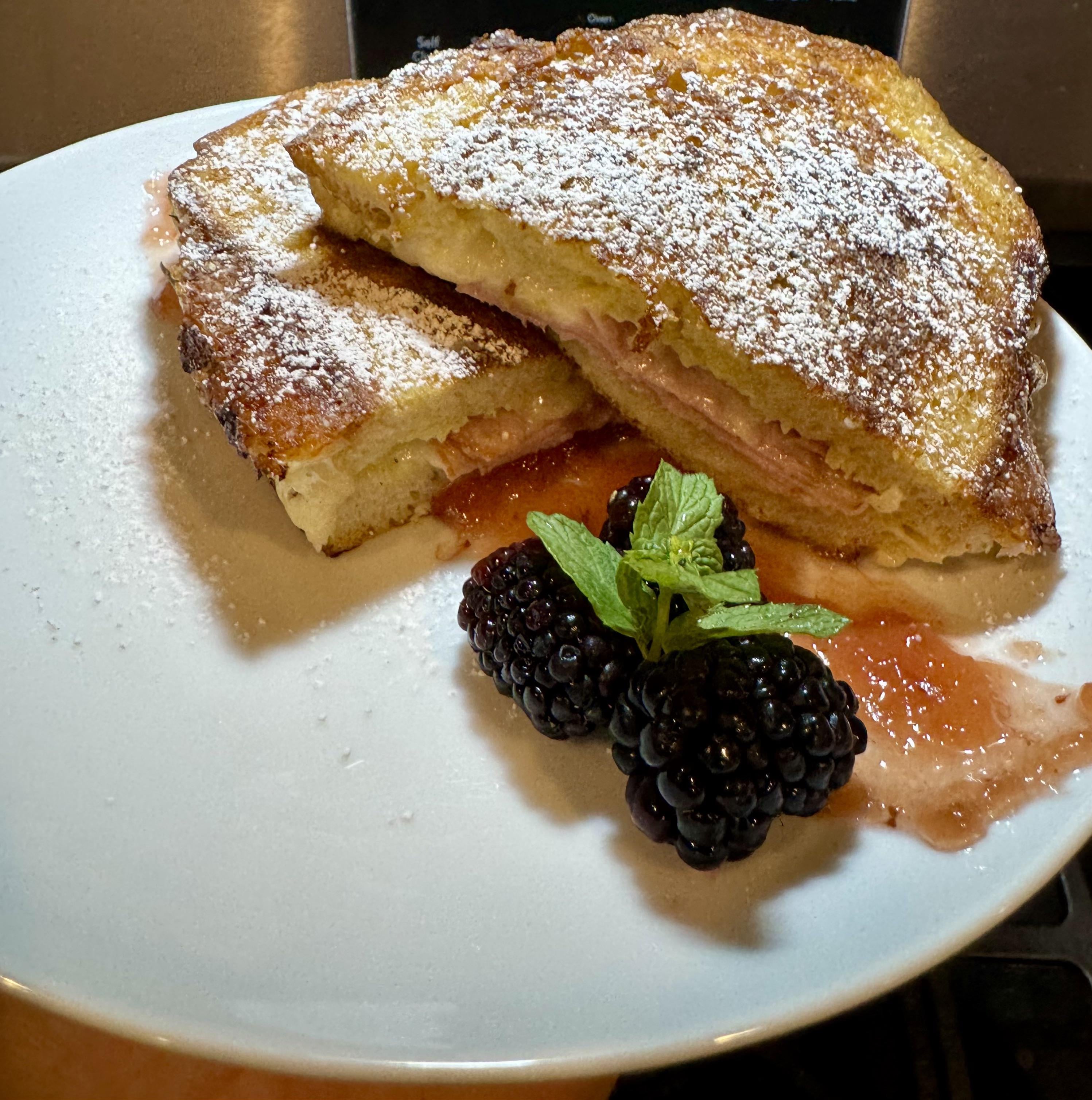 Plated with raspberry jam, and fresh black berries and mint, finished with powder sugar. Cheers!