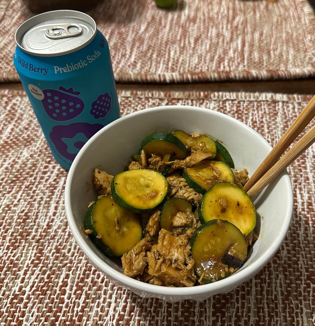 Dinner: Korean BBQ chicken + zucchini stir-fry ~ recipe from Hungryroot .com & Poppi wild berry prebiotic soda (333 calories, 32G protein)