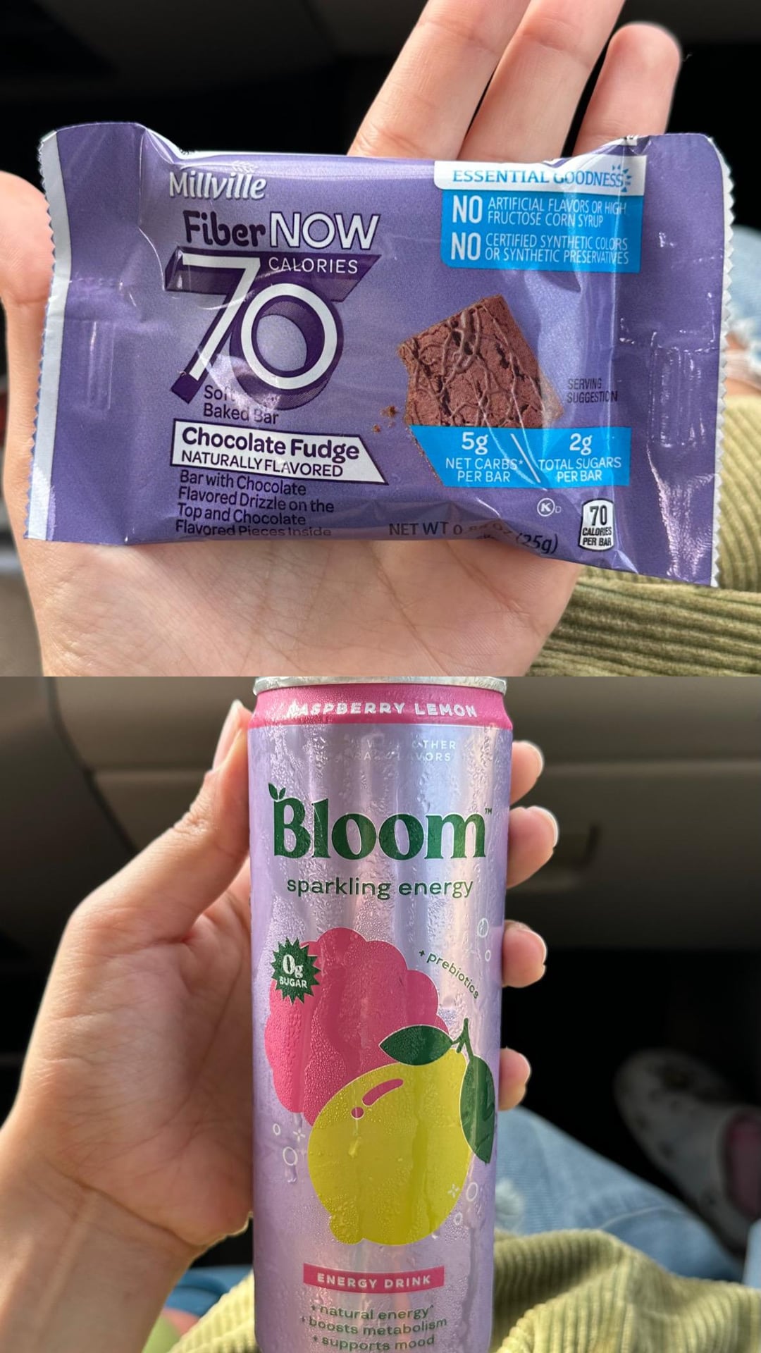Breakfast: FiberNow chocolate brownie, Bloom raspberry lemon sparkling energy drink (80 calories, 2g protein)