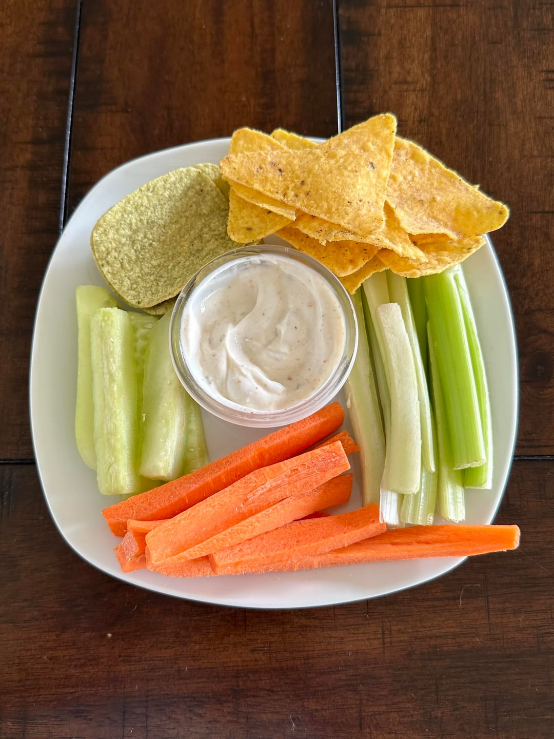 Snack 2: snack platter with celery sticks, carrot sticks, cucumber, sour cream & onion veggie chips, Simply cool ranch Doritos & Greek yogurt spicy “ranch” (216 calories, 8g protein)