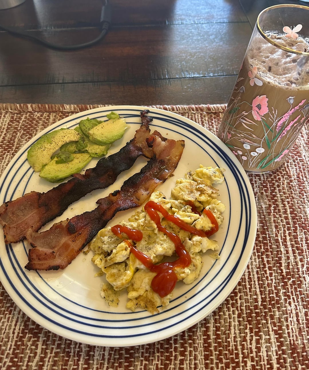 Brunch: scrambled eggs & whites with ketchup, maple bourbon bacon, avocado, mushroom coffee with almond milk & peppermint mocha cold foam (337 calories, 26g protein)