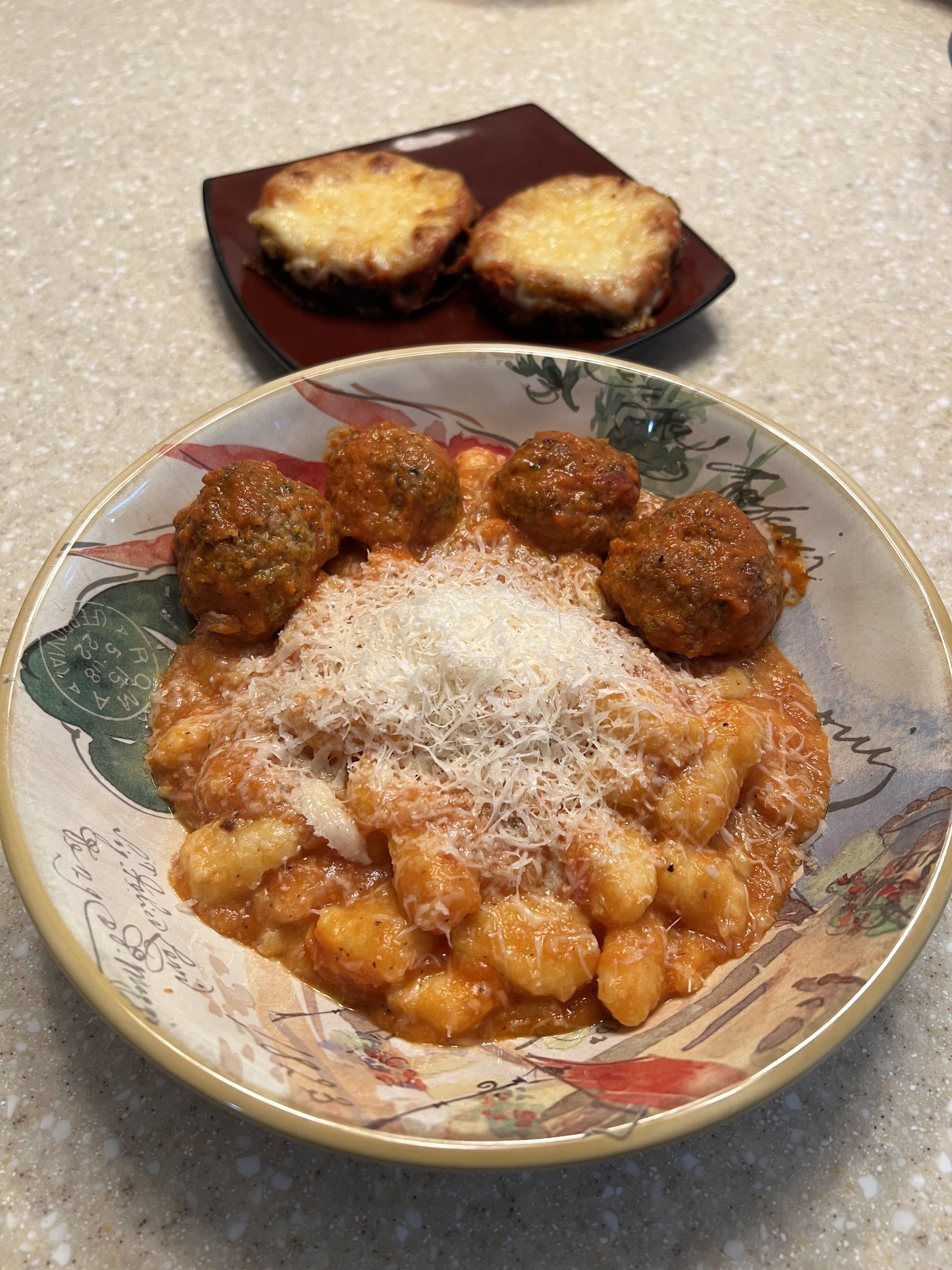 Homemade gnocchi and meatballs with a little eggplant parm on the side
