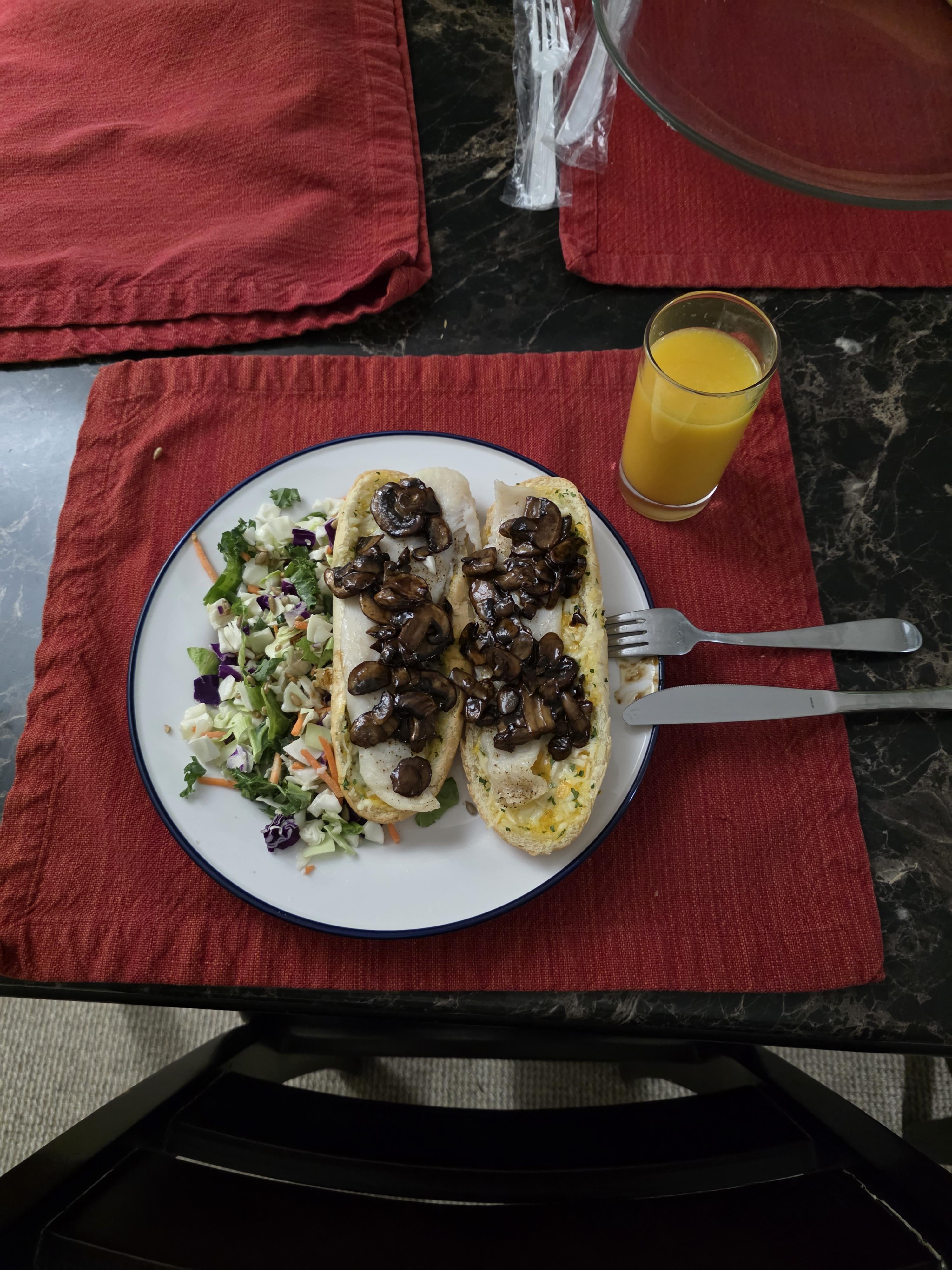Cheesy garlic bread with baked Basa on top and teriyaki sautéed mushrooms on top of that, salad on the side