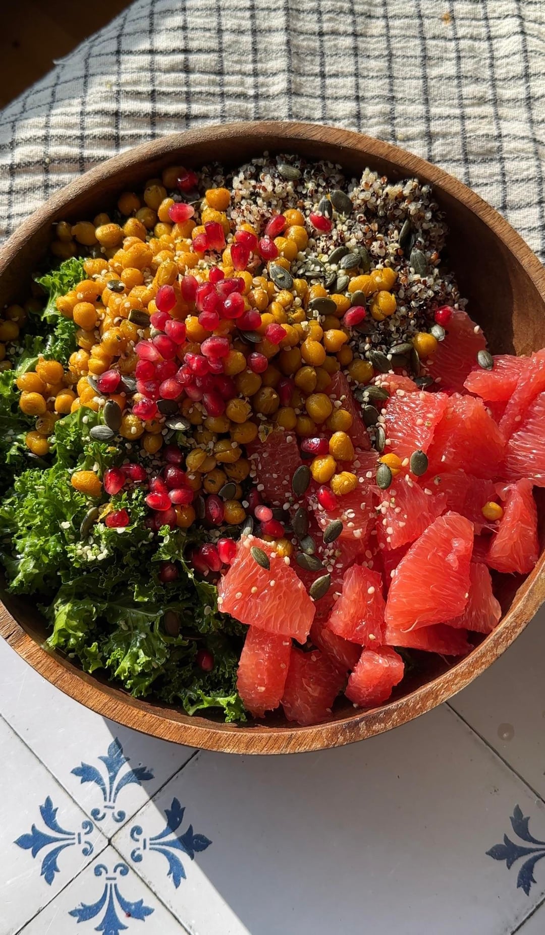 Add quinoa, grapefruit, roasted chickpeas, pomegranate, pumpkin seeds, hemp and flaky salt.