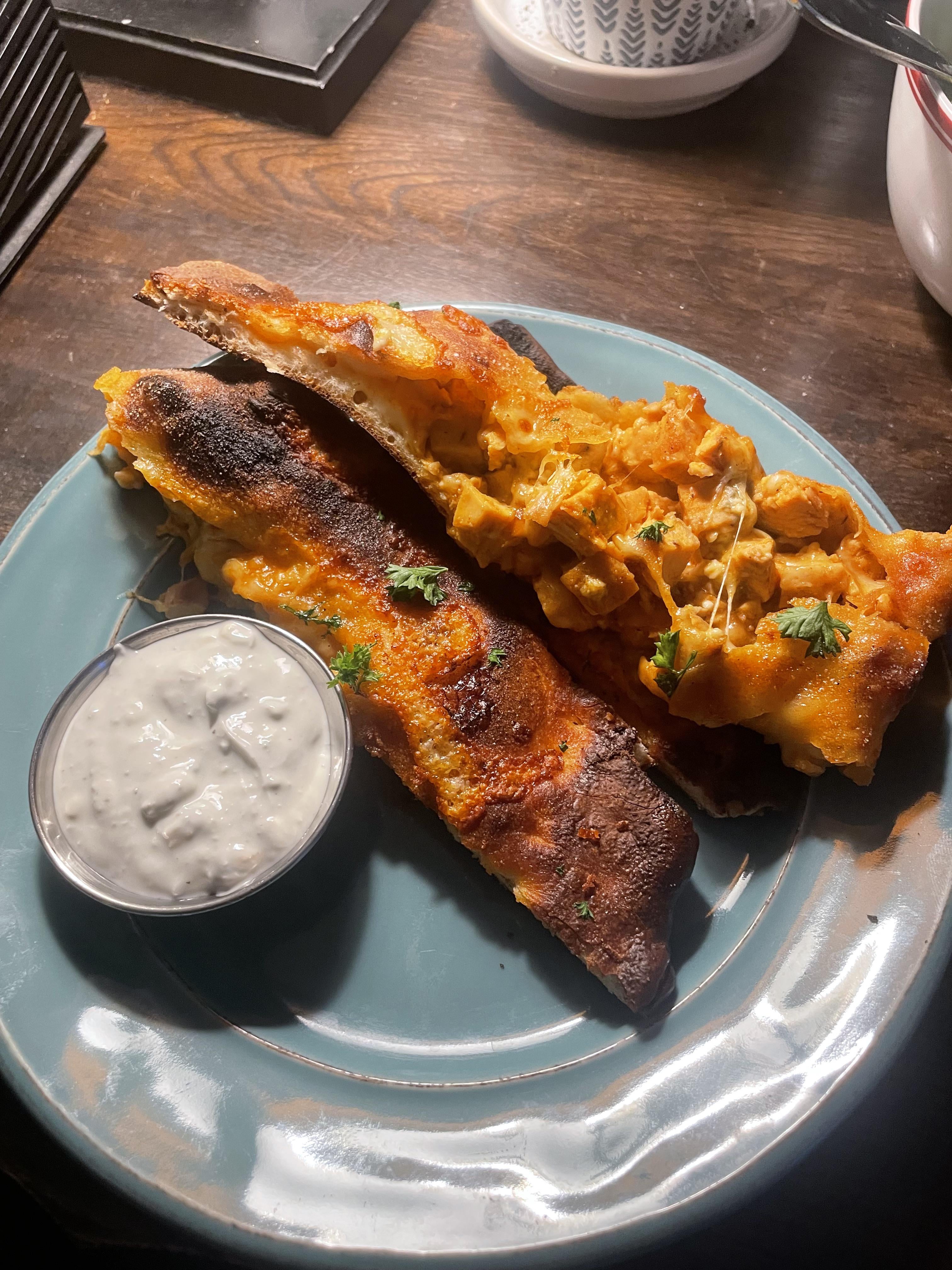 Homemade buffalo chicken calzone & blue cheese dip