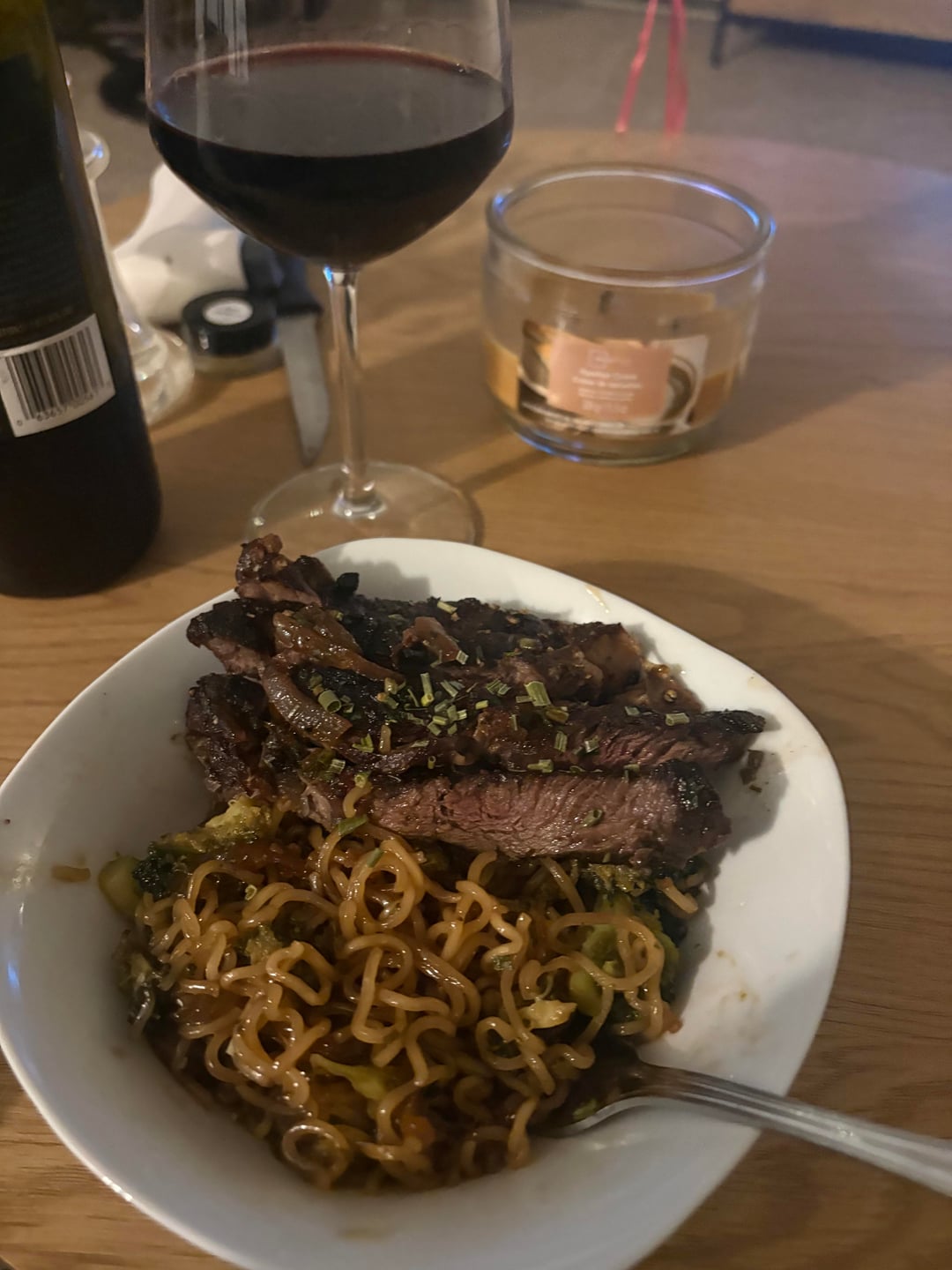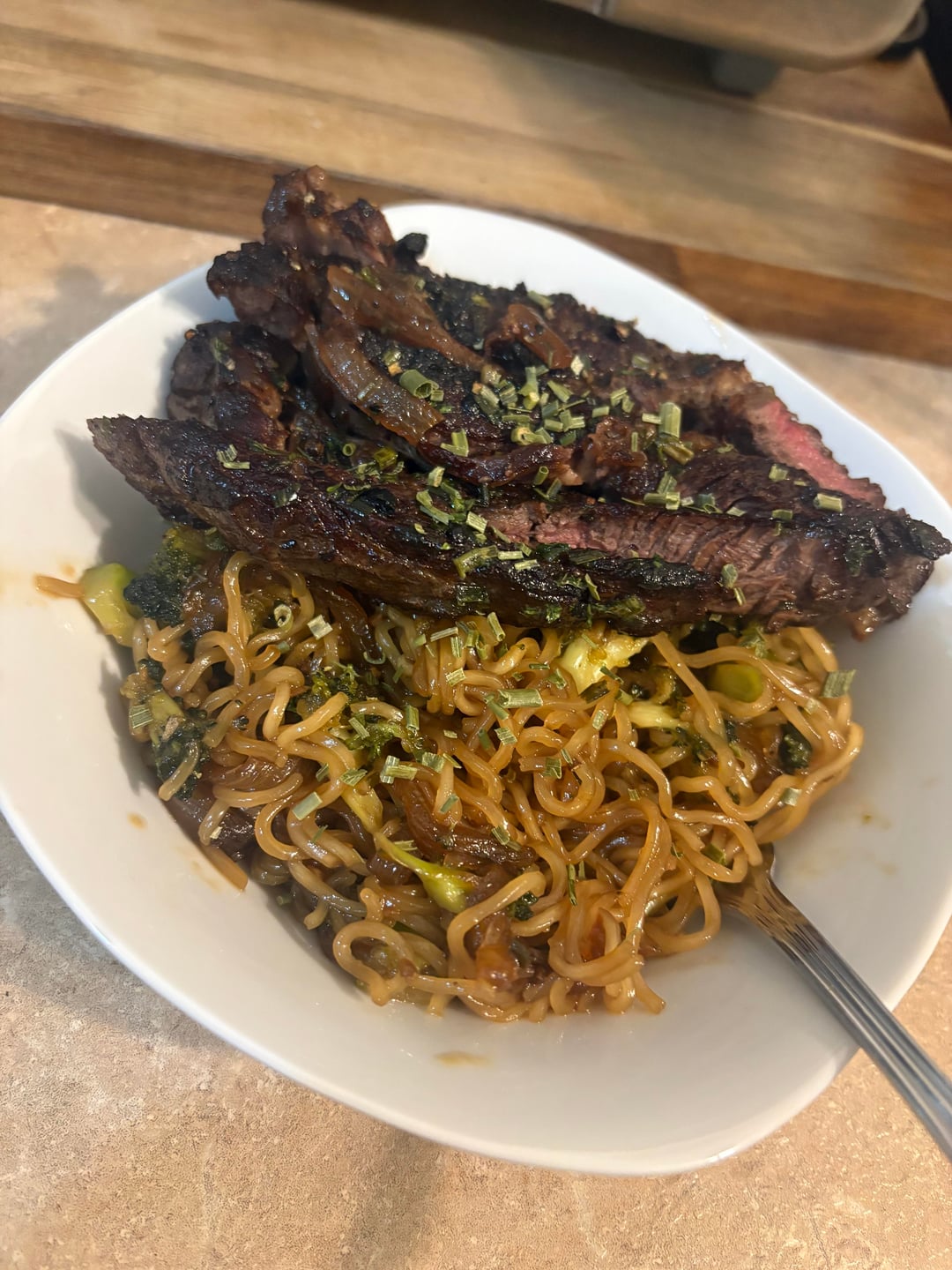 Rib eye!! Salt and peppered and fried till it had a nice crust. Took off to rest. I then melted butter with herbs (parsley and chives) roasted garlic and sautéed onions, added steak back to pan and covered it in that buttery goodnesss!! Added more ground peppercorns. Served on steamed honey garlic brocolli noodles!!! With some more chives on top!! So good!!