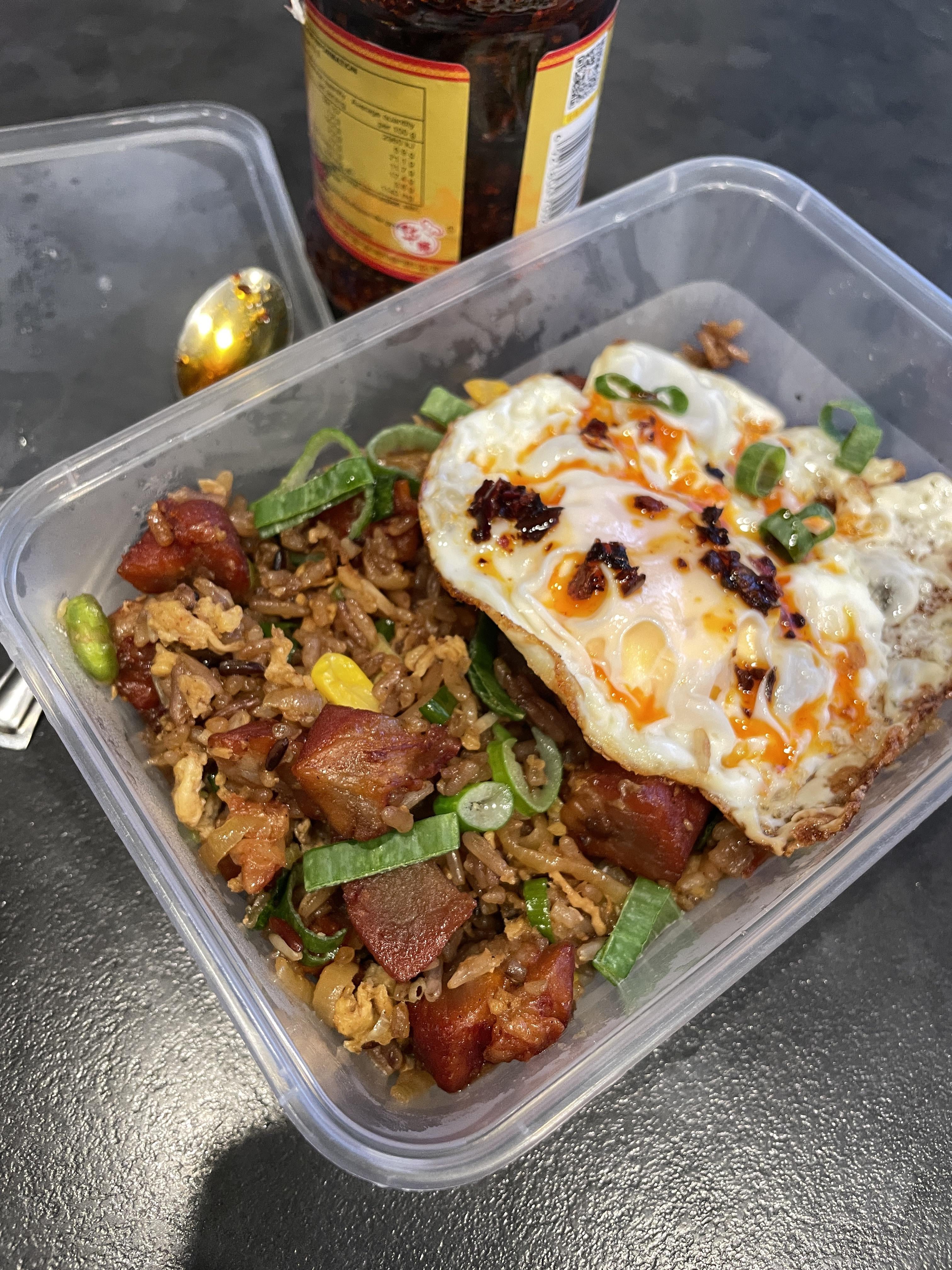 bingebaking on February 17, 2026 7:08 am Made fried rice from left over bbq pork and of course, mandatory fried egg as an add-on. Get 3 portions out of it and keep it in a deli square tub for a fridge space management lol