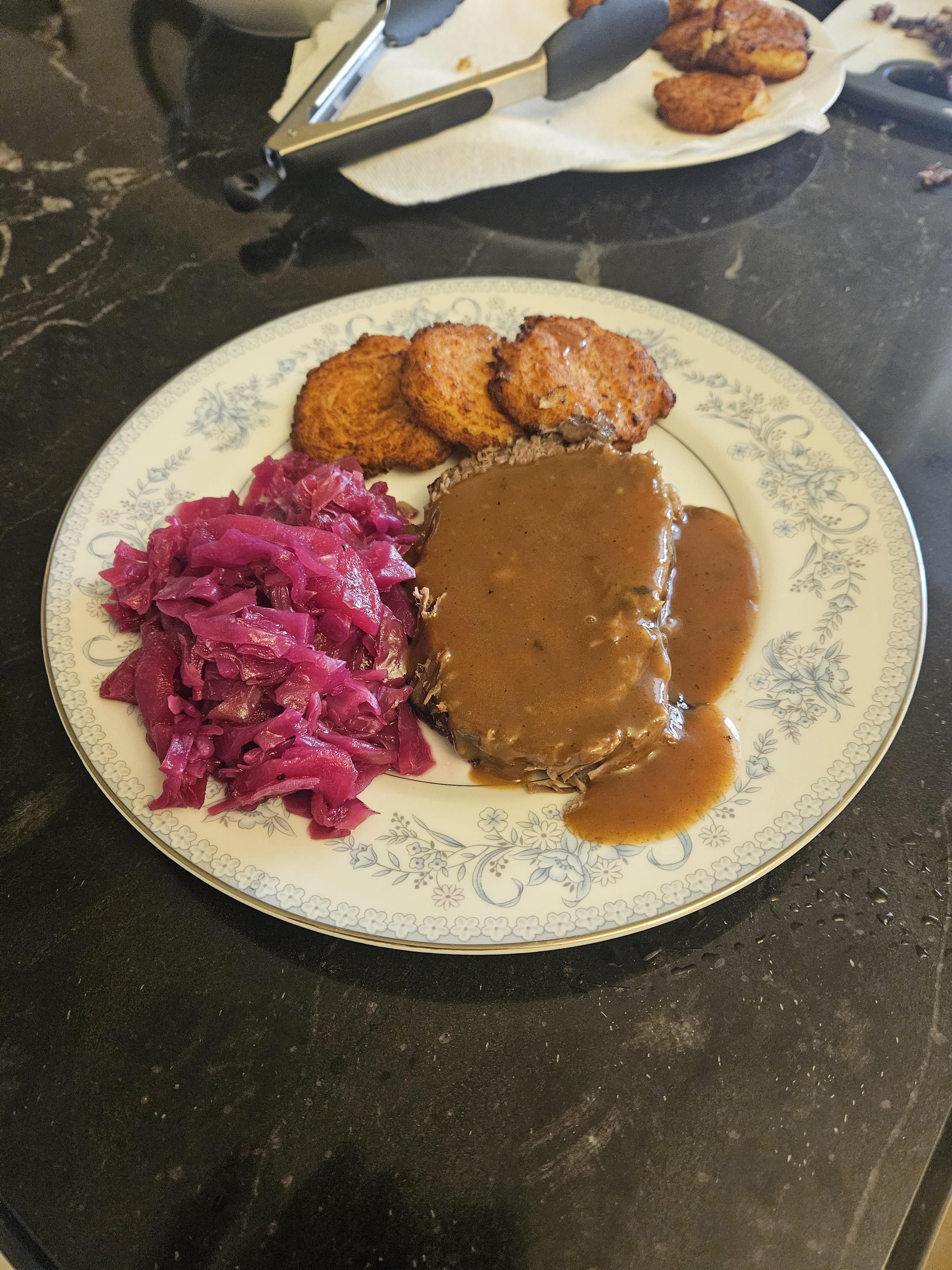 Marinate Rump Roast or Chuck Roast in equal parts vinegar, red wine and water with onion, carrot, garlic, celery and pickling spices and marinate for 3-14 days.