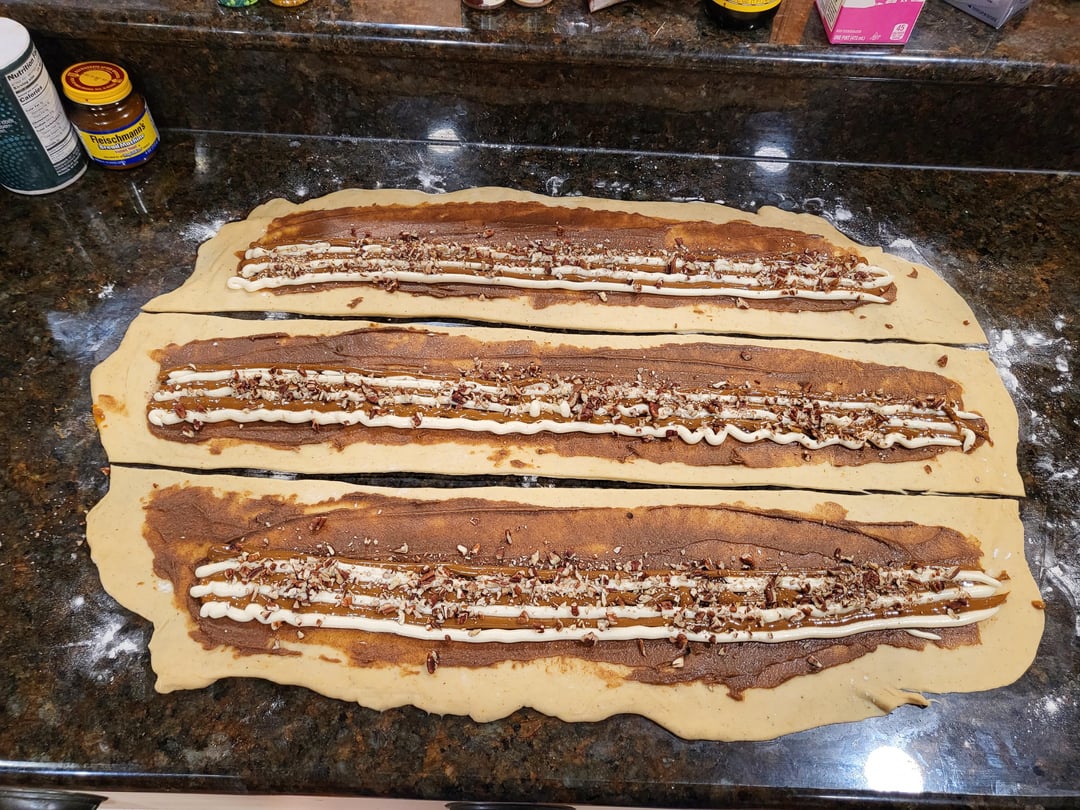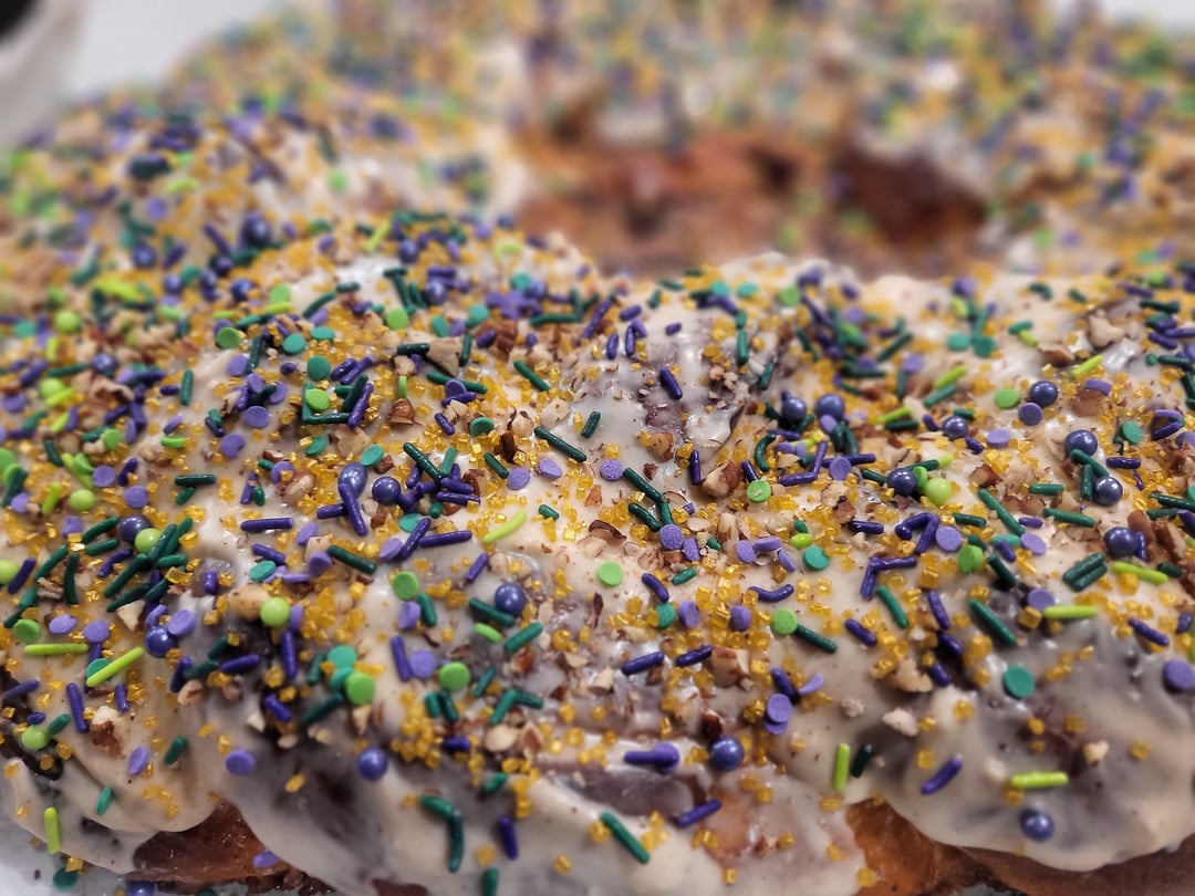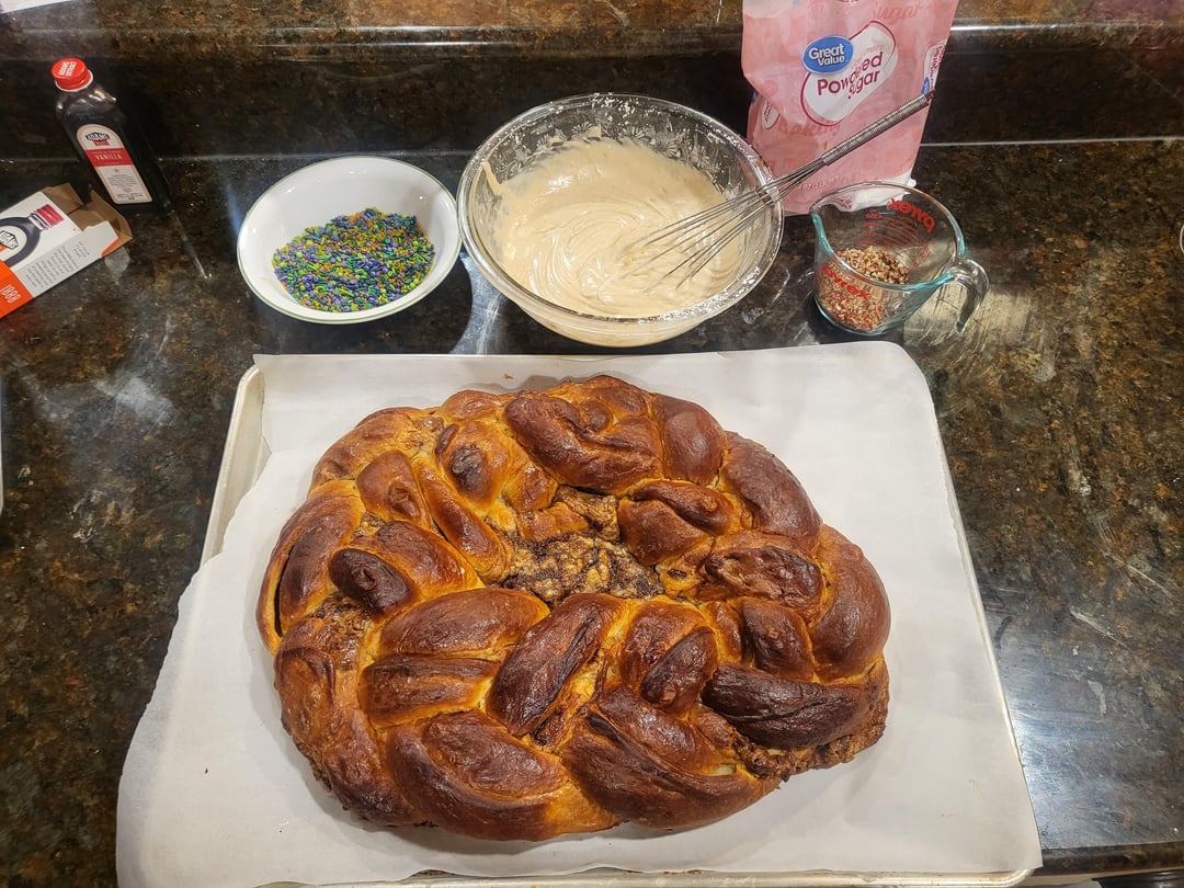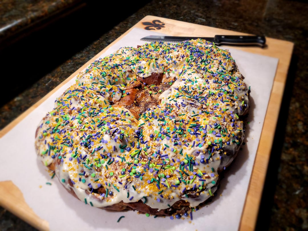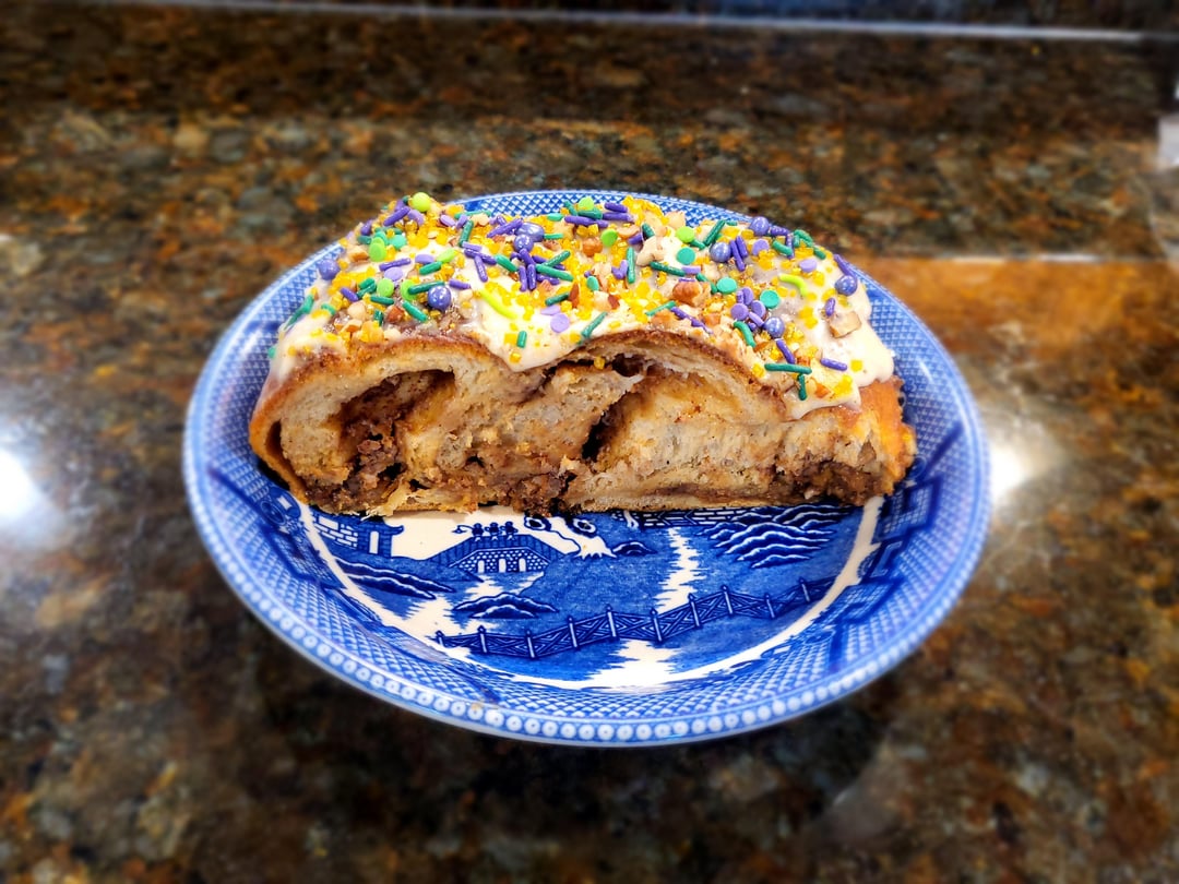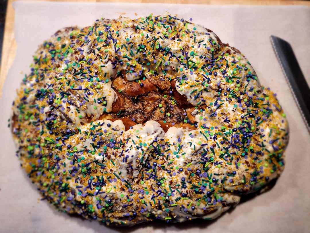 Moved last year, now live 5 hours away from my favorite king cake, so I decided to do it myself. Pecan praline with cream cheese stuffing and a steens cane syrup glaze by gordito_y_barbon Food