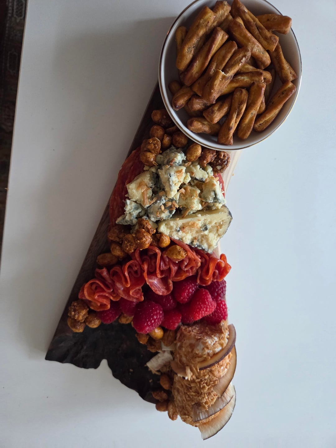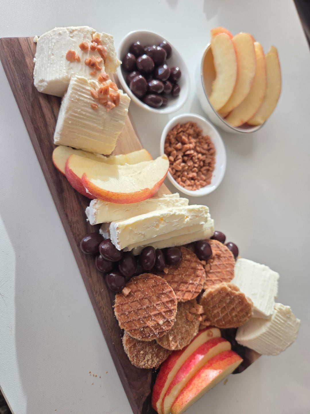 I can't at all remember which cheese the cheese man gave me… But I've been getting little snackies to go on the board from the bulk shop. First board is a carmel apple cheesecake board for Valentine's, the other was a hot honey board!