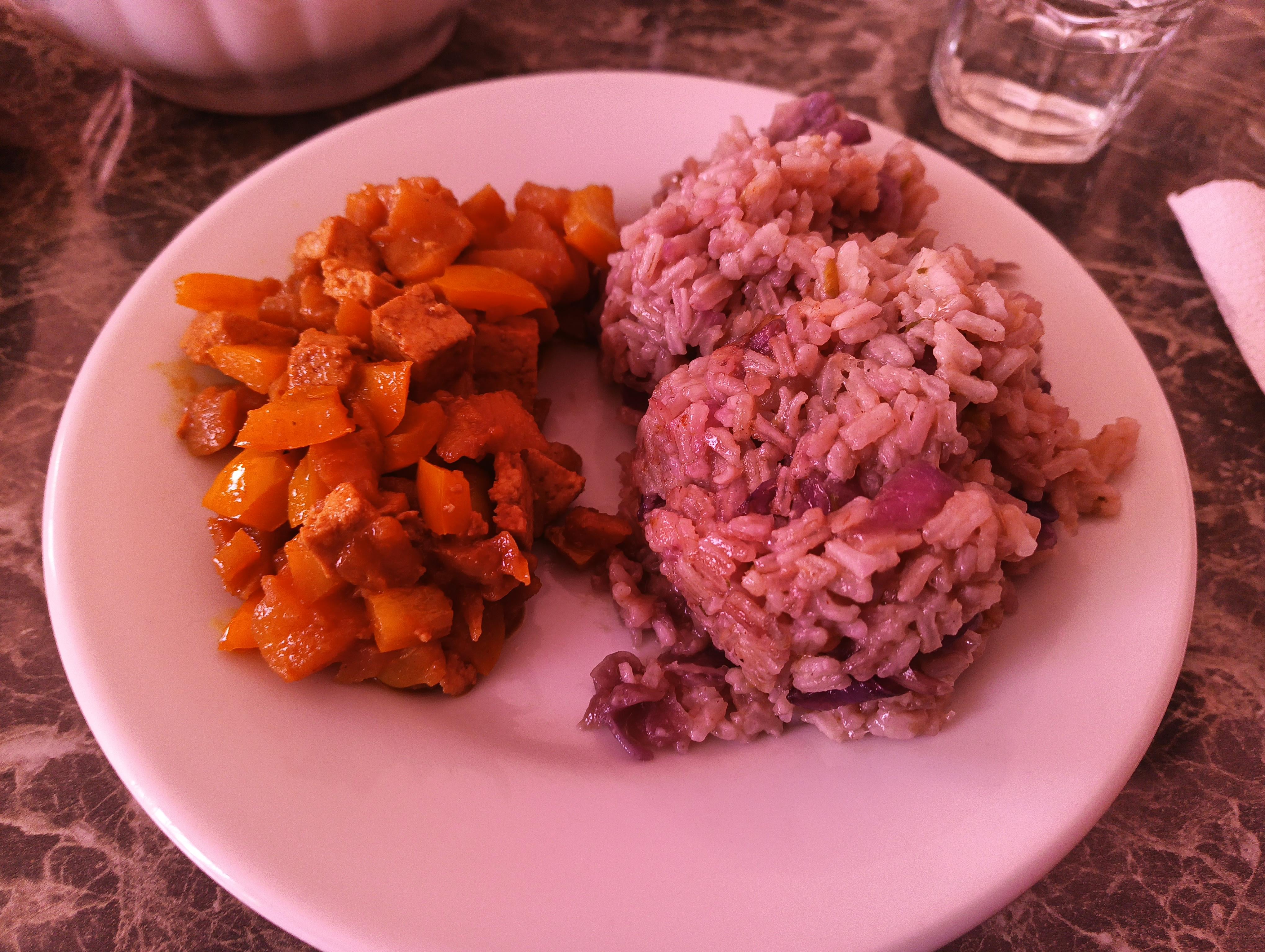 Rice with red cabbage sided with sweet-and-sour curry tofu, apples and yellow pepper by N_tuukuulu Vegan Food Vegan Food Porn
