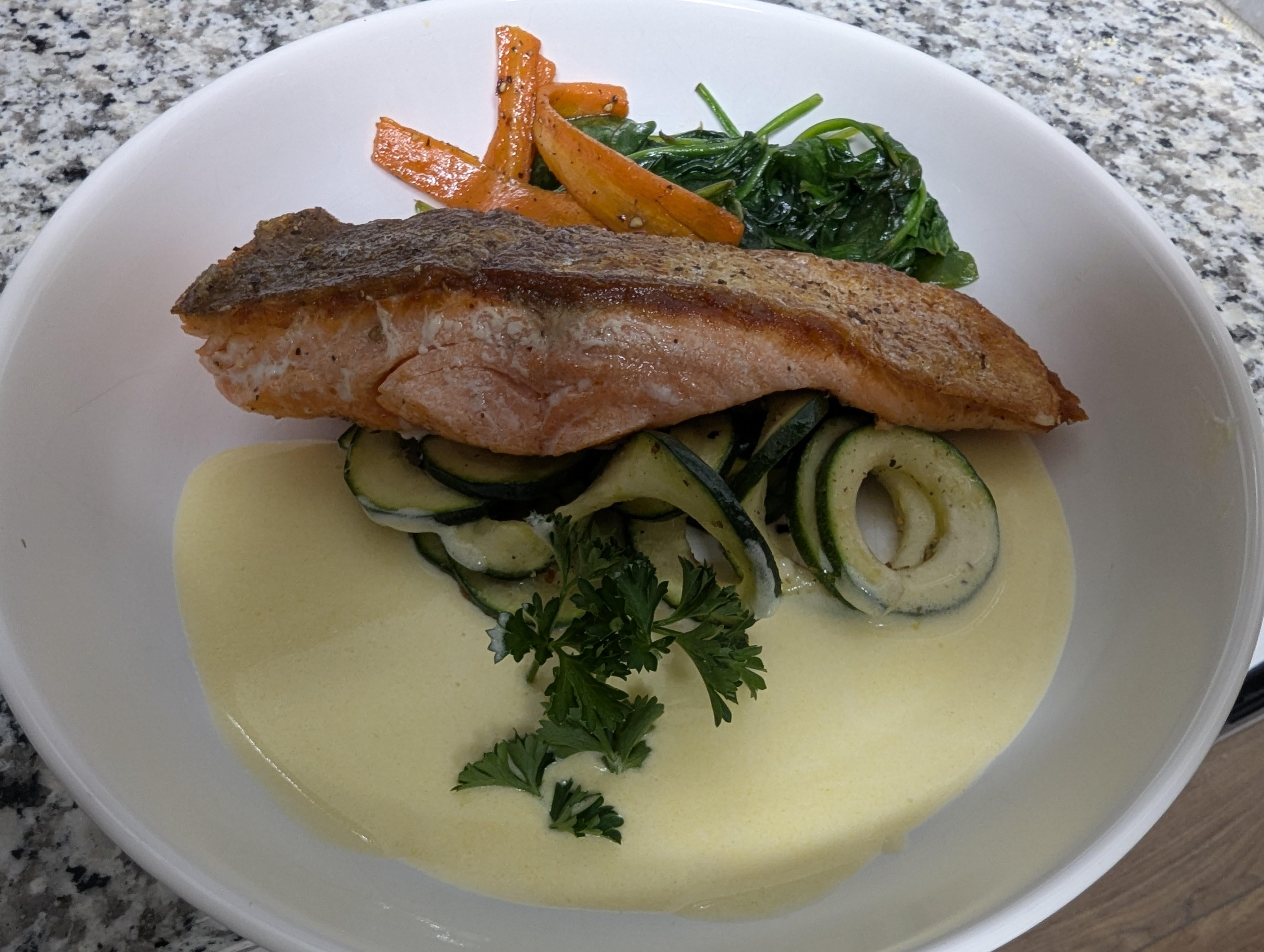 Crispy skin salmon with a beurre blanc sauce and vegetables [OC]