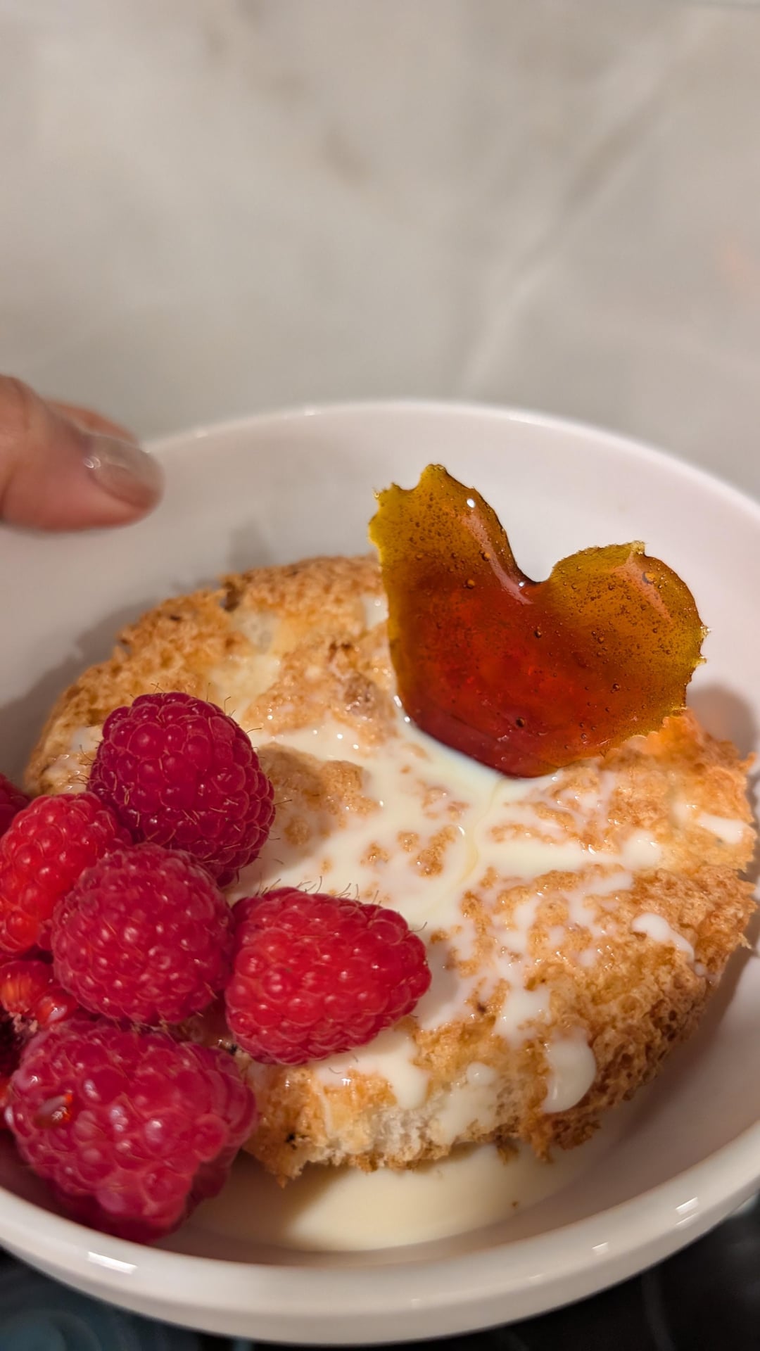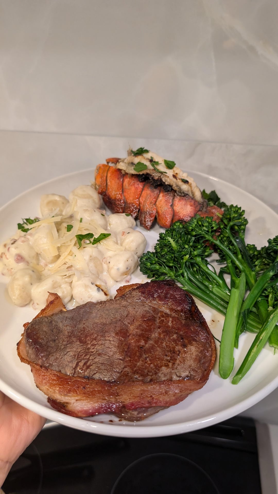 Valentine’s Day birthday meal for my husband: bacon wrapped steak, lobster and gnocchi carbonara. For dessert, homemade tres leches cake with raspberries.