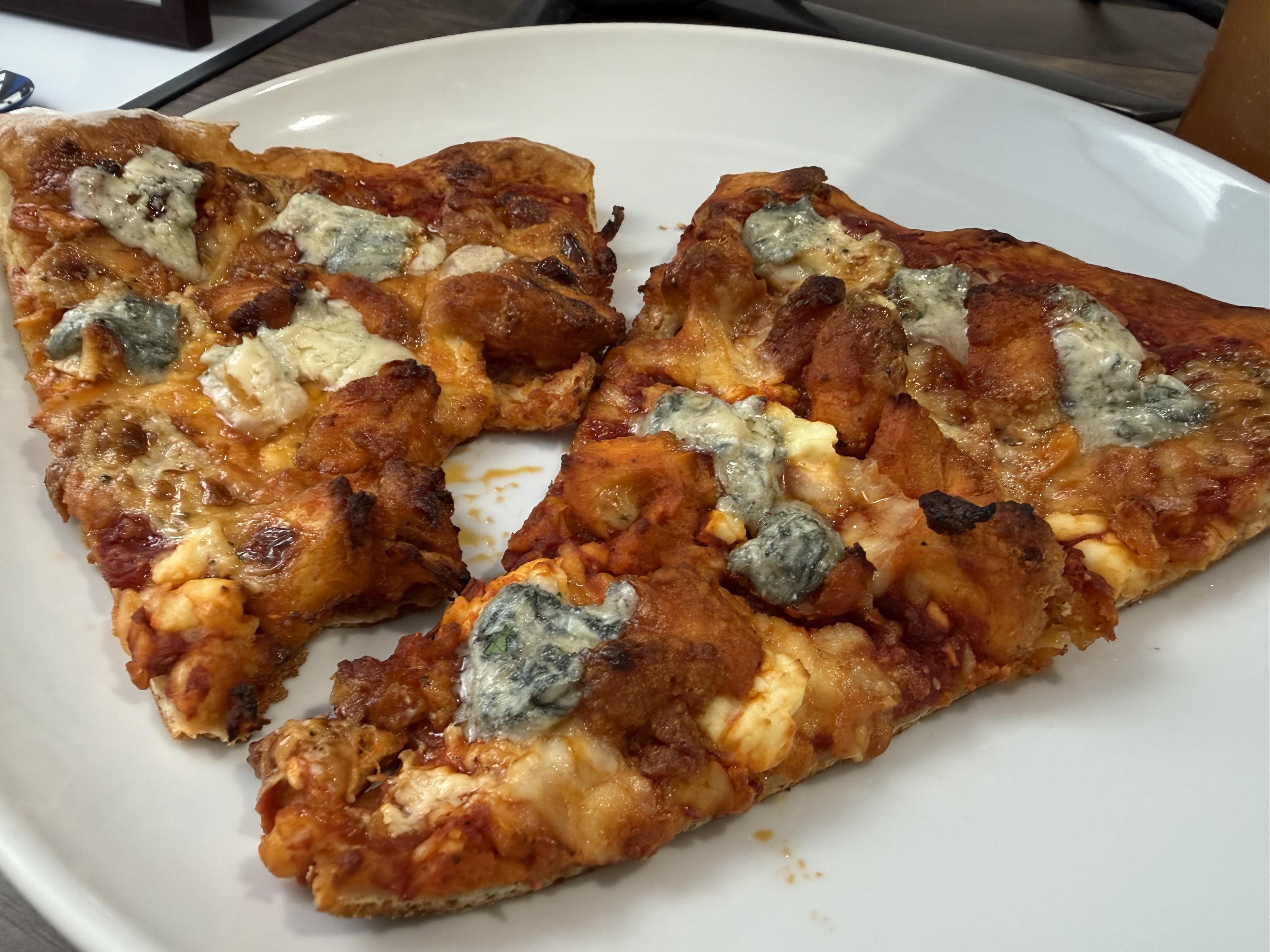 I don’t think you’re supposed to cook the blue cheese with the pizza.