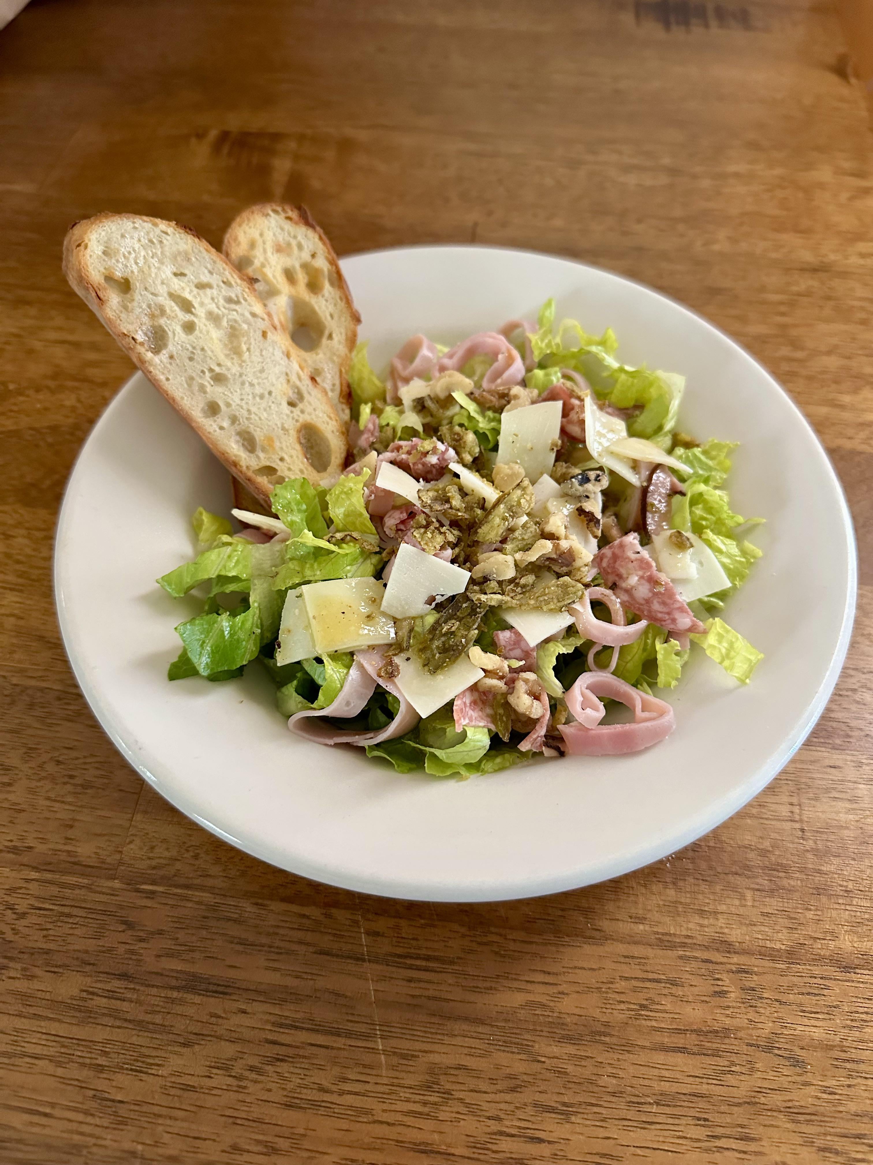Salad on a Bed of Romain with Ham, Salami, Provolone, Walnuts and a Red Wine Vinaigrette. Served with Butter Toasted Asiago Bread. [OC]