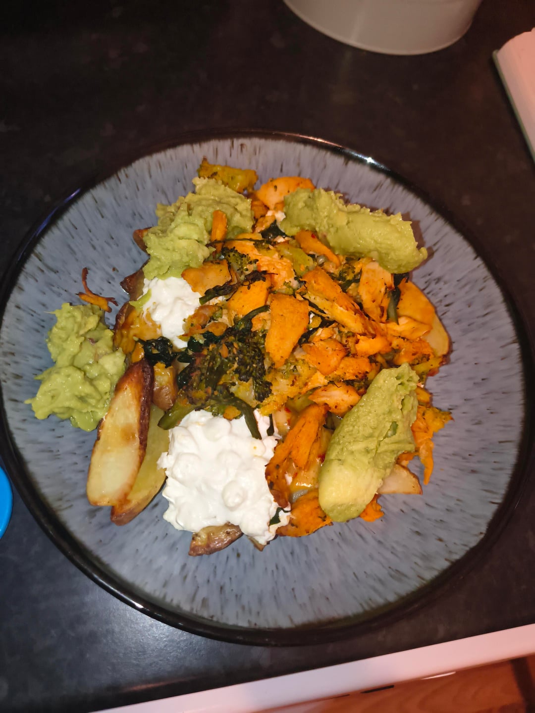 meal 3: air fryer chips (fries), buffalo chicken, cottage cheese and smashed avocado (prebought mix)
