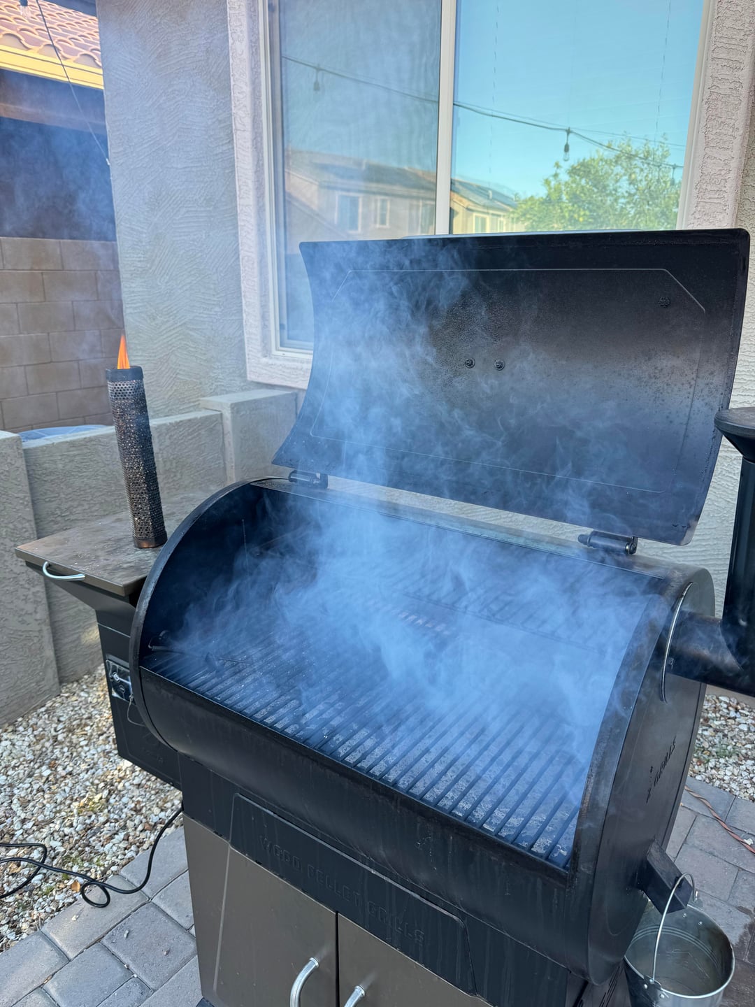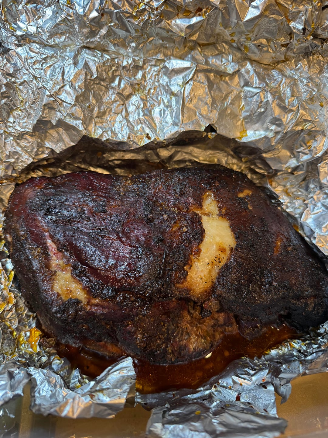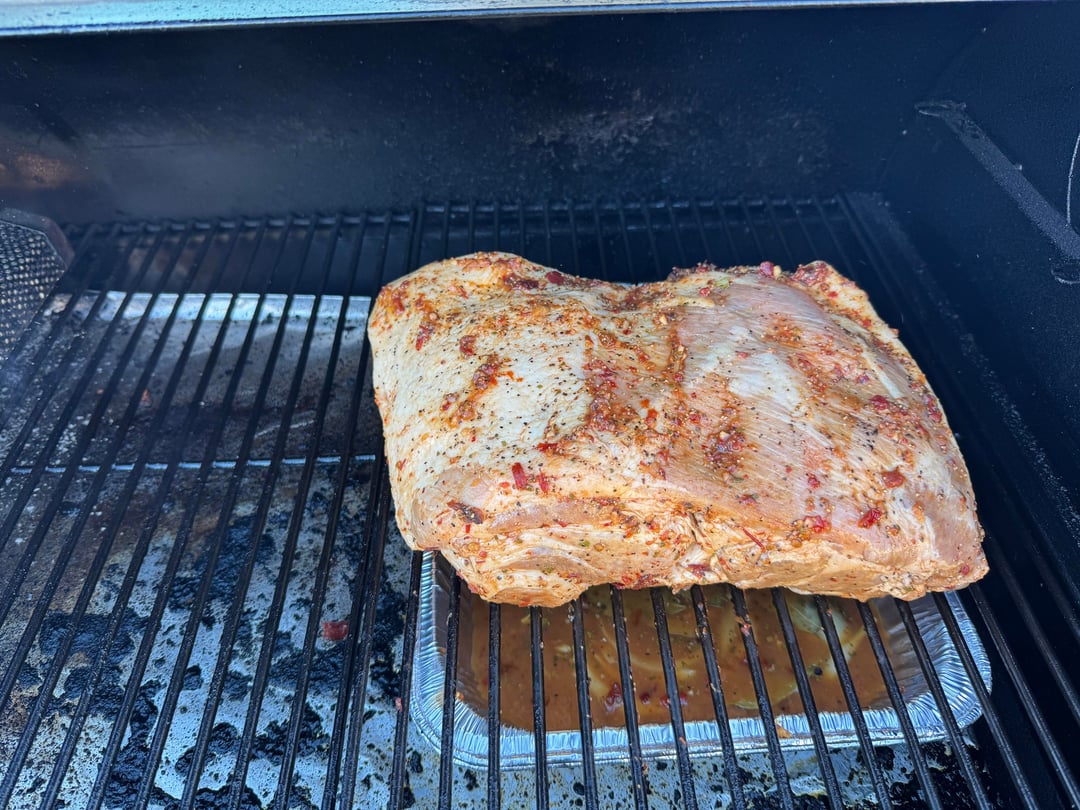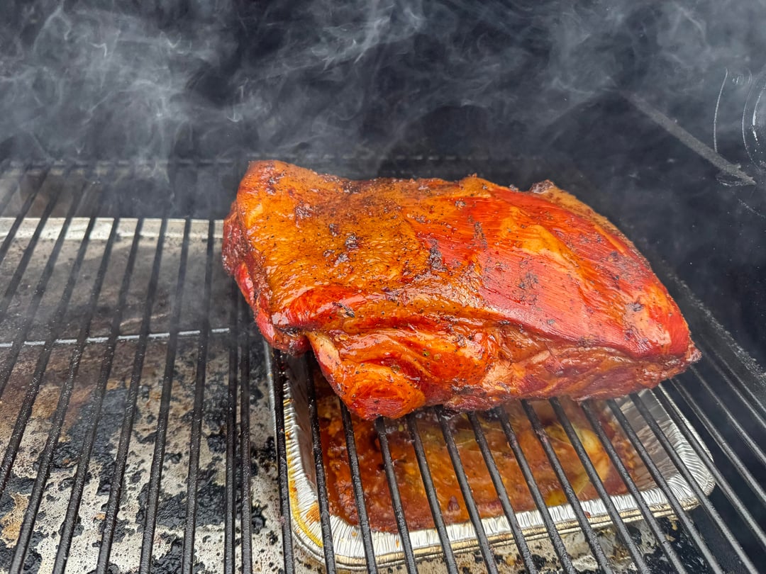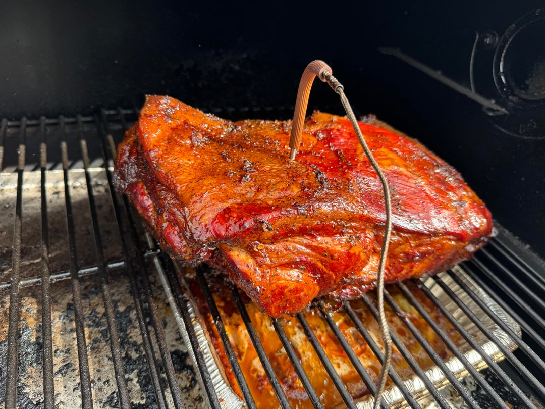 After marinade, smoked the pork at 250F for 11 hours using post oak pellets, until internal temp hit 201-203F (wrapped around 165F). I kept a tray under the pork during the whole cook that had the marinade from the night before to catch the drippings while smoking I would later use when pulling the pork.