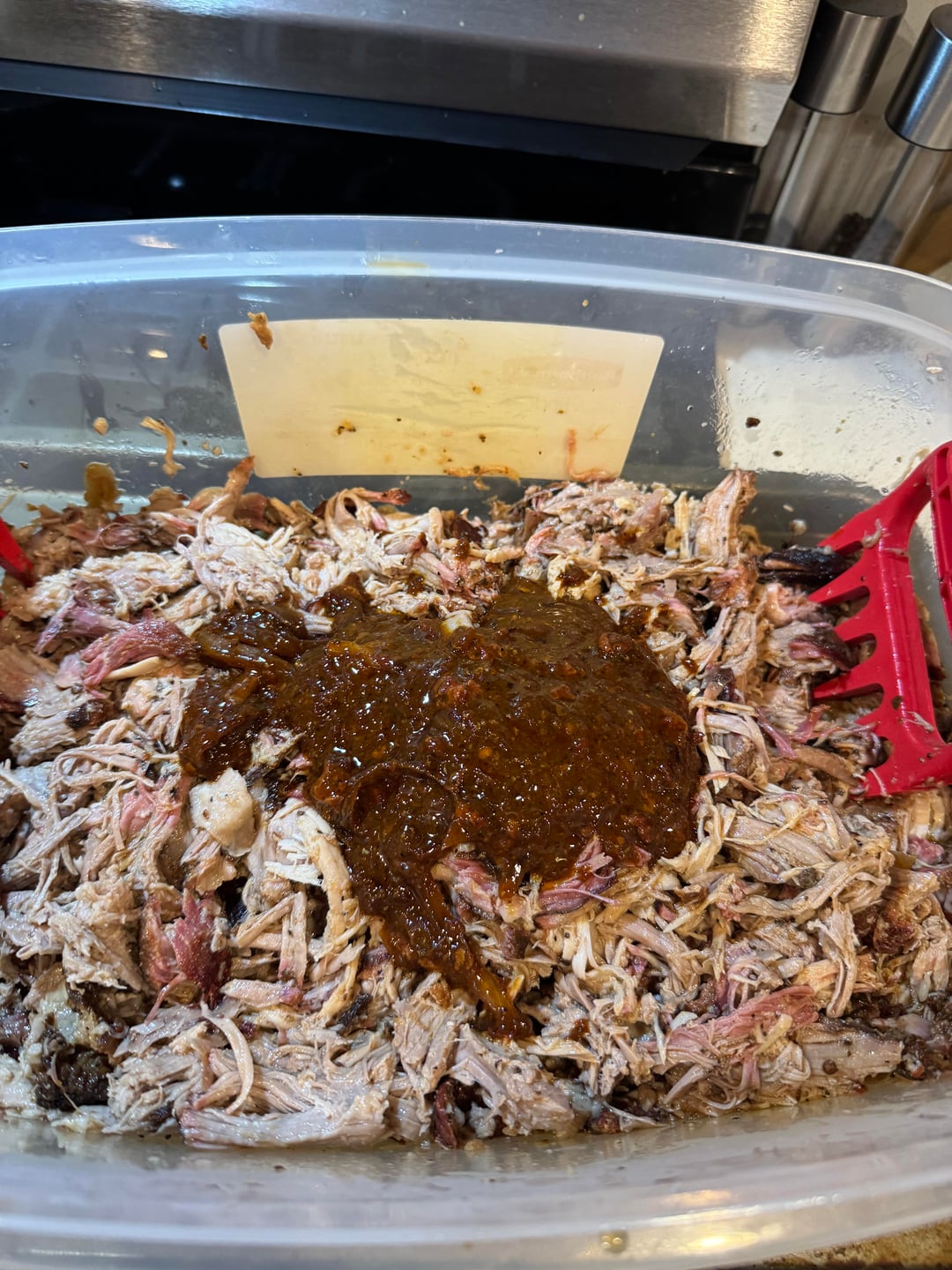 Once it hit temp, I let the pork rest until temp got down to 165F. Started pulling the pork (the aroma while shredding at this point was insane, I had to sneak a quick bite). I poured back over the dripping tray that was spicy, smoky, deep pork flavor drippings, and with a touch of sweetness from the orange juice over the pulled pork.