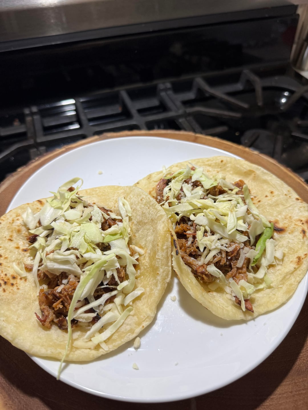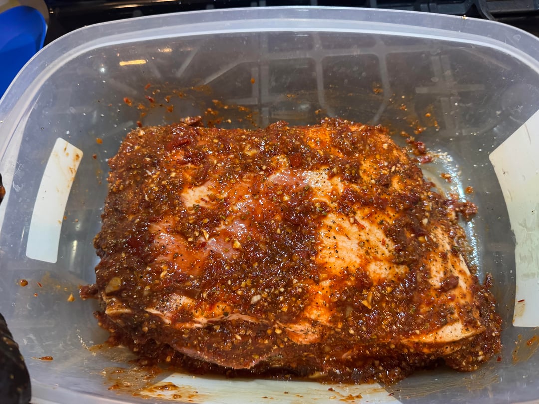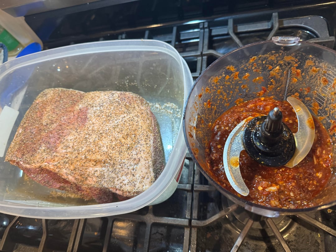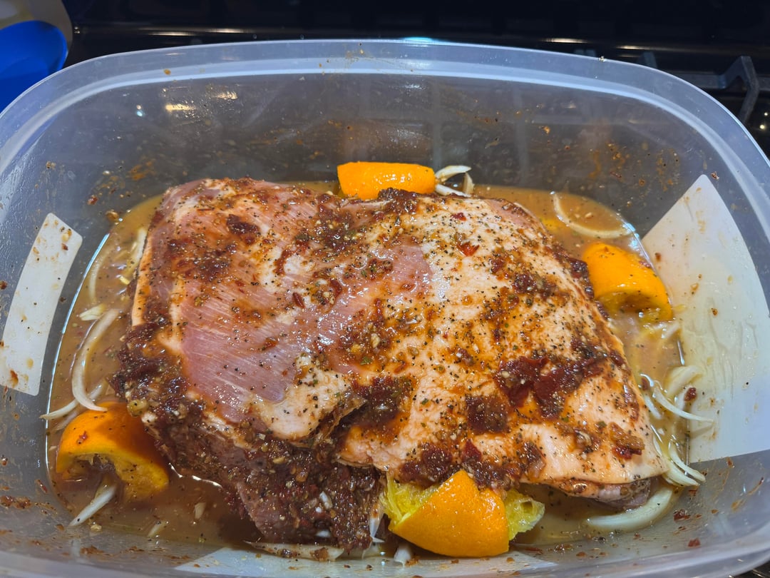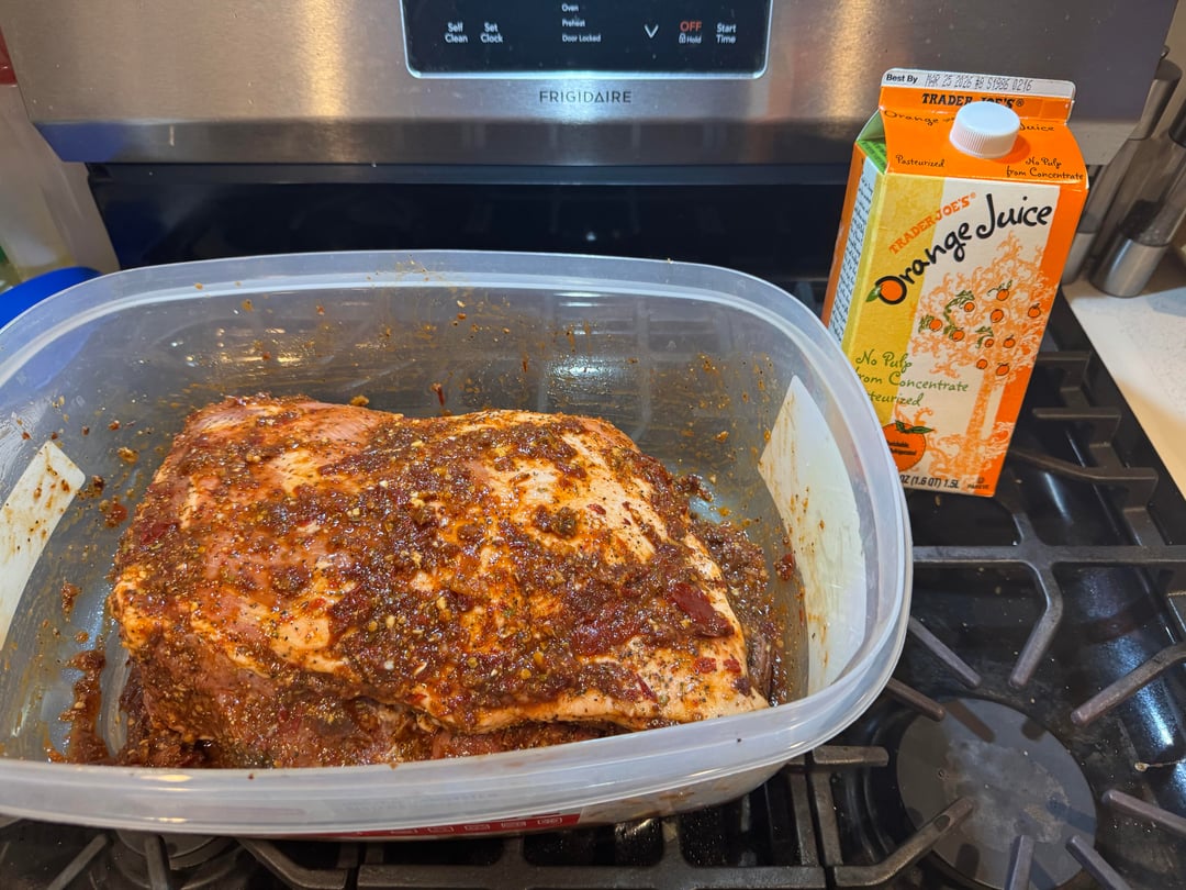 Method: Pork Shoulder, used a Barbacoa Marinade (adobo chilies, lime juice, apple cider vinegar, salt, pepper, cumin, Mexican oregano, garlic, onion), Mojo style (orange juice, oranges, limes, garlic, onion, bay leaves). Let the pork sit over night in the blended marinade.