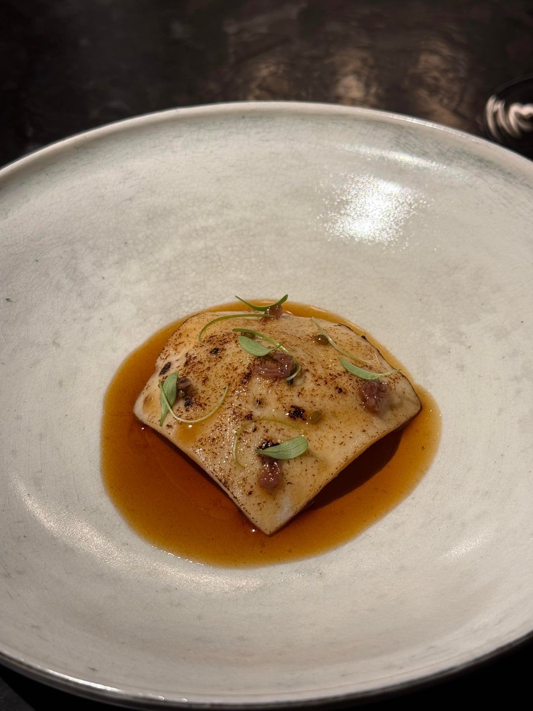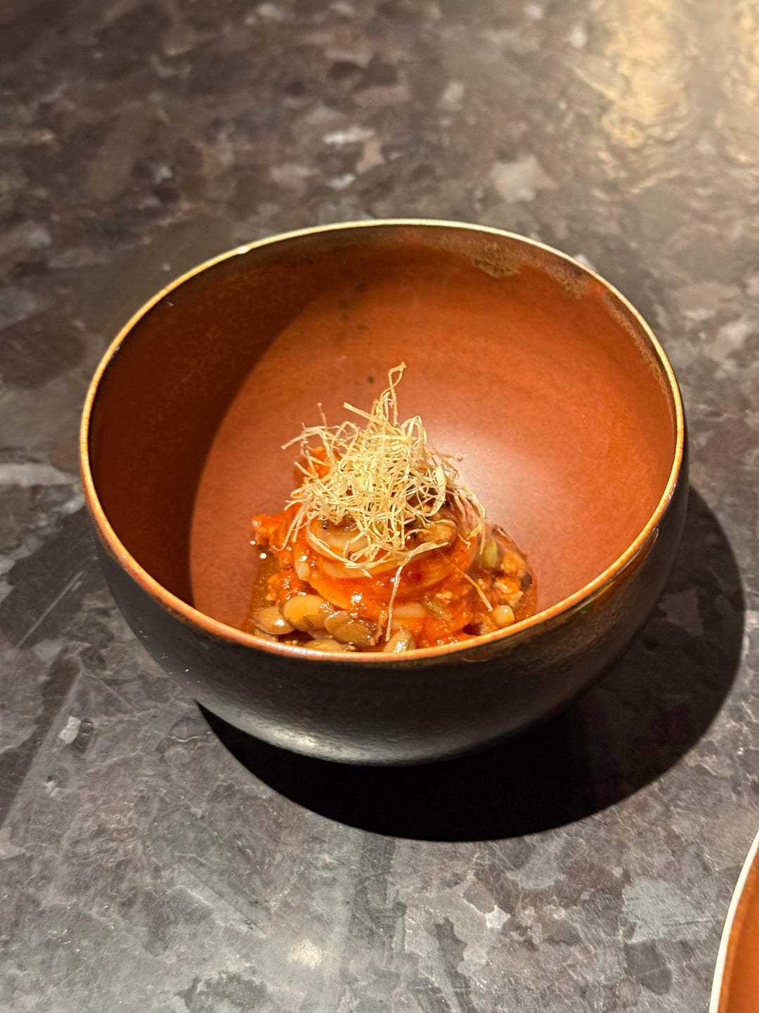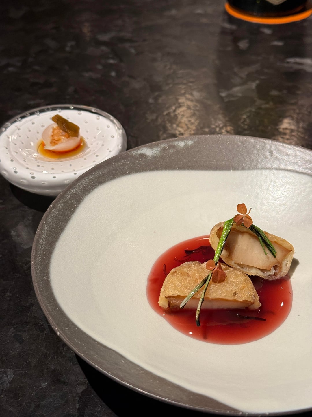 Abalone – another course I enjoyed! This was a spin on korean “tangsuyuk”, but with abalone and a pomegranate sauce. The abalone was very tender, and I normally don’t love tangsuyuk sauce but it was cool to see how well a pomegranate base worked for it. The banchan was a pickled pearl onion which provided extra acidity, but it had a chili oil on it which felt like clashing flavors. I love anything pickled though so I wasn’t complaining.