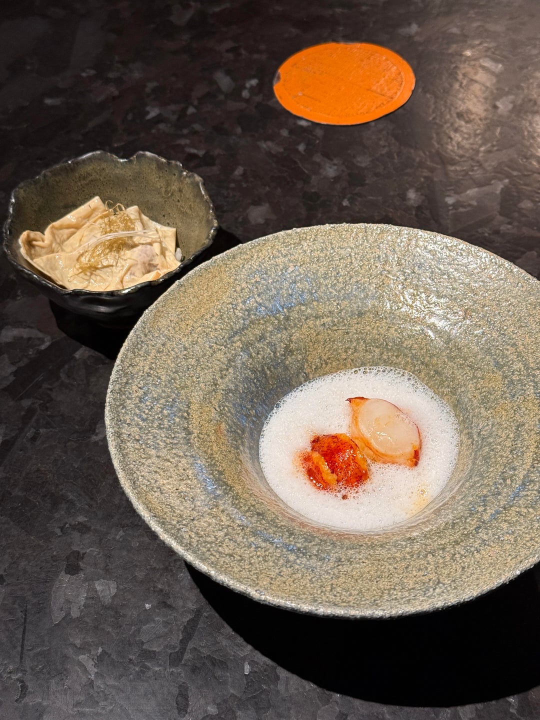 Scallop – very yummy, meant to be eaten in one bite. Kim bugak was crispy. I think I would have preferred a little less rice inside proportionally to the rest of the bite.
