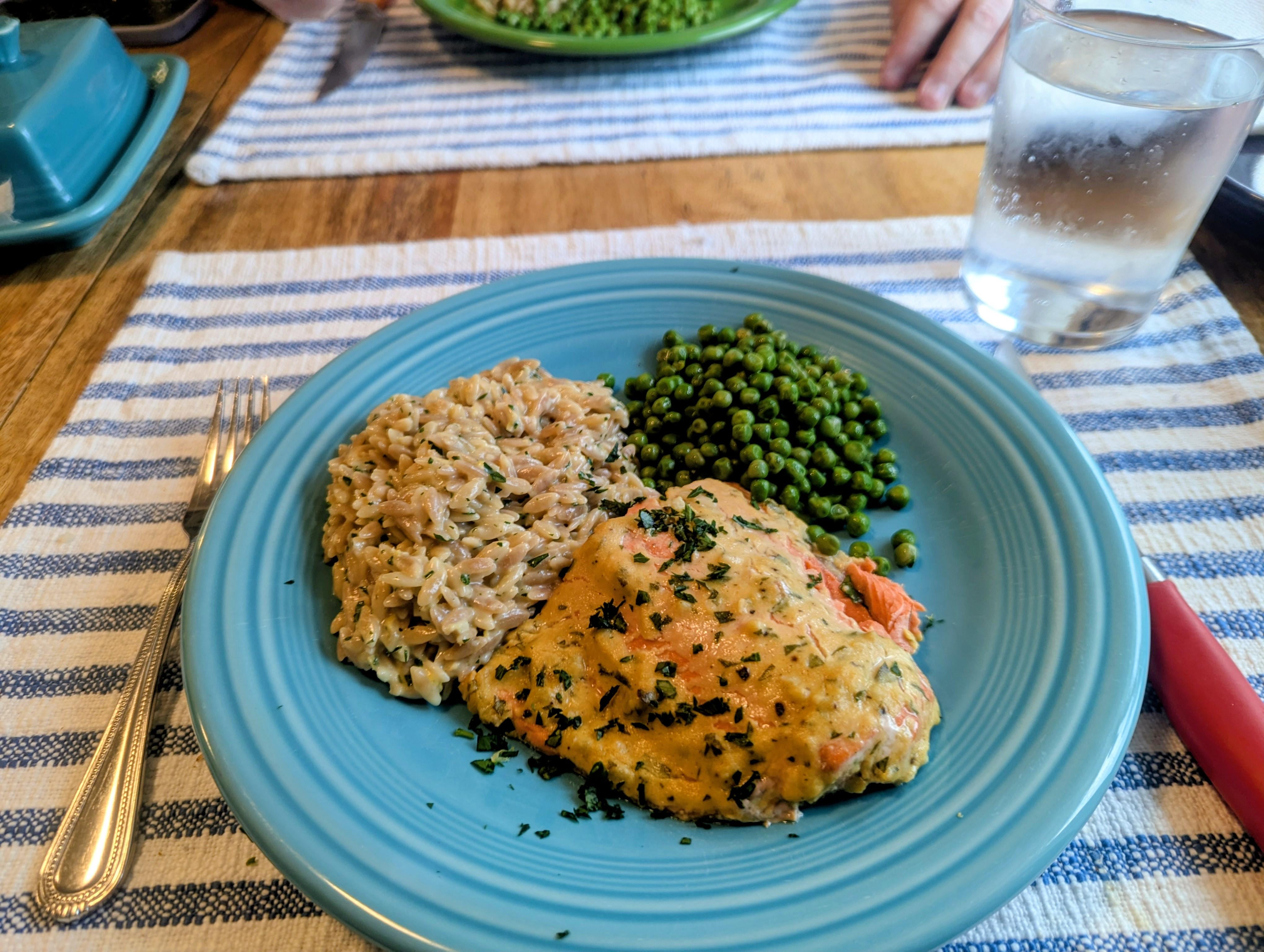 Tonight was busy so dinner was quick & simple. Oven-baked salmon with Dijon sauce, creamy lemon orzo and some buttered peas 😋 by Dusty_Old_McCormick Dinner Tonight Tonight's Dinner