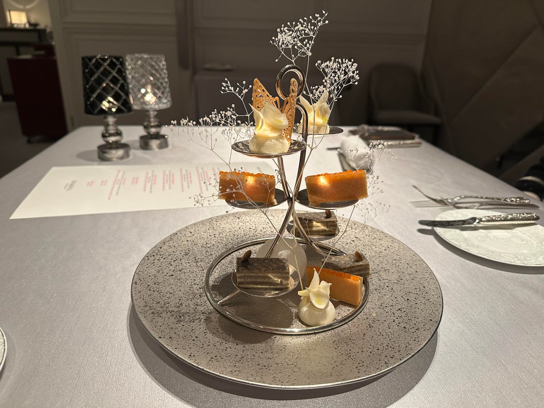 Courses: (Special End of Year Menu) Multi-course classic French tasting menu (~10 courses); starting with amuse-bouche to appetizers, mains, desserts, and mignardises.