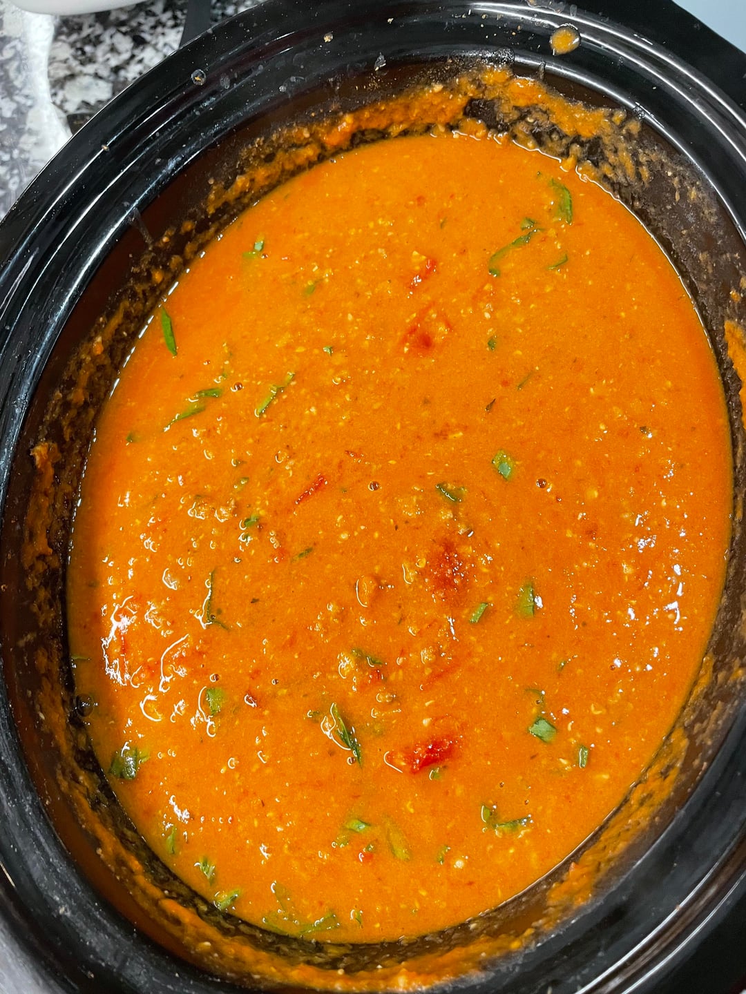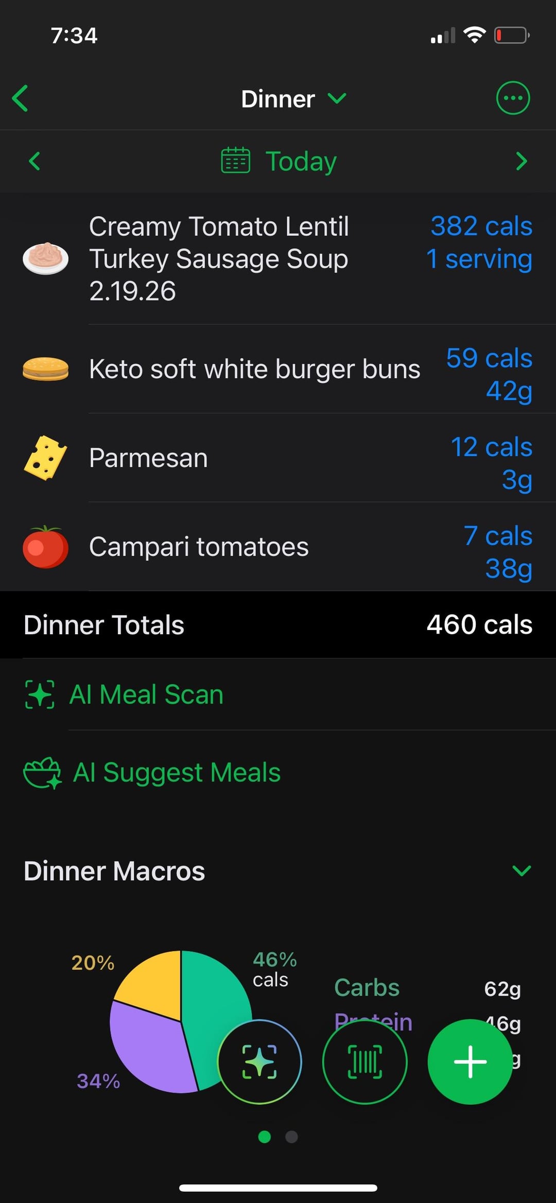 Dinner: Creamy Tomato Lentil Turkey Sausage Soup (made in the slow cooker), topped with fresh basil, chopped tomatoes and grated Parmesan, served with garlic bread made from a keto bun