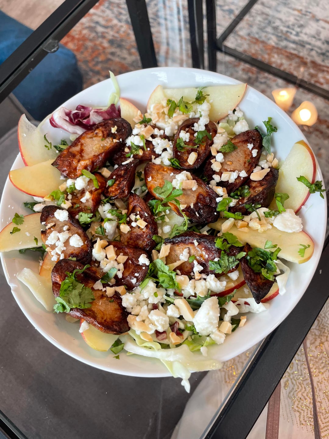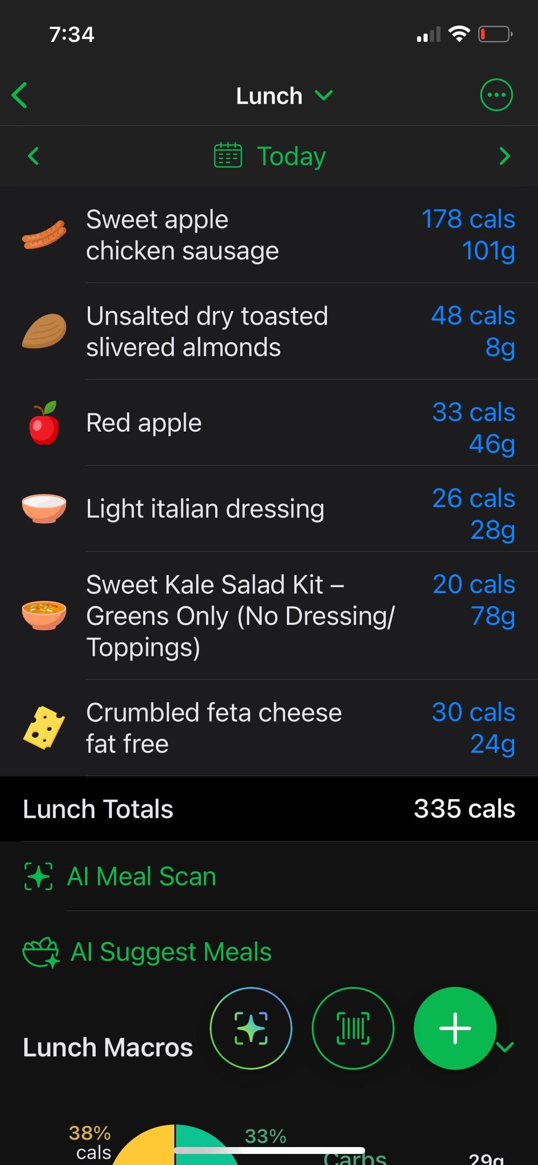 Lunch: Salad Base is the Sweet Kale Chopped Salad kit from Aldi just without dressing or toppings, Olive Garden lite Italian dressing, thinly sliced Cosmic Crisp apple, Trader Joe’s Sweet Apple Chicken Sausage (sliced and air fried), Fat Free Feta, toasted Slivered Almonds