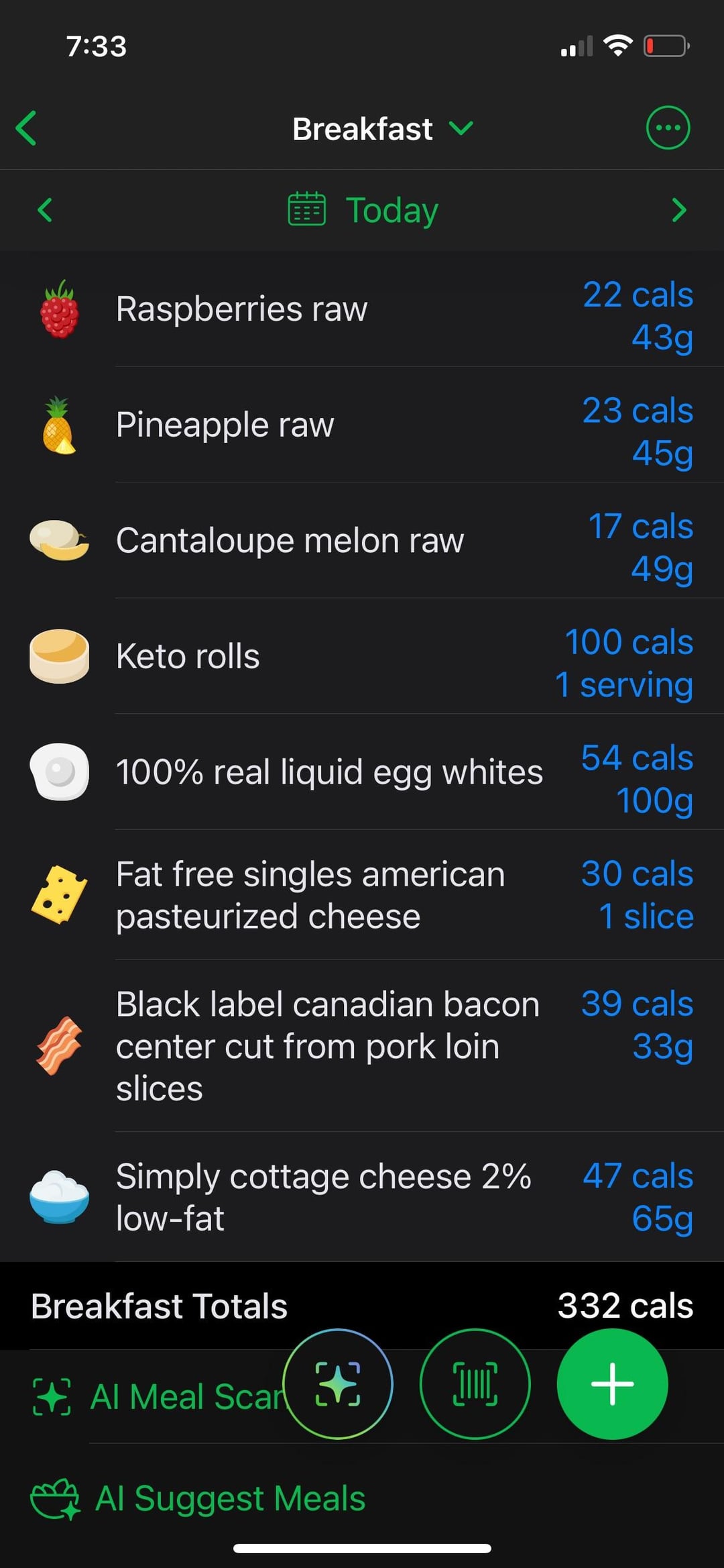 Breakfast: Sandwich with Egg Whites, 2 pieces of Canadian Bacon, Melinda’s Truffle Hot Sauce, Fat Free American Cheese Slice, Keto Sandwich Bun. Side of Cantaloupe, Raspberries, Pineapple, Good Culture Cottage Cheese