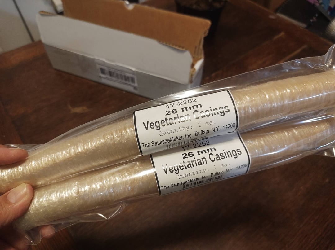 Some of this year's seitan Lap Cheong sausages with edible vegan casings. I only make them once a year for the Lunar New Year for the clients of my vegan catering. The casings are not necessary; I use them because they provide a more professional presentation. They are made with water, vegetable glycerin, and starches. No, I don't know why the company chooses to use the word "vegetarian" instead of "vegan".
