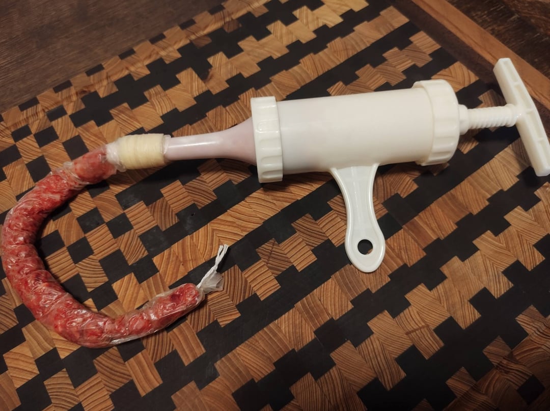Prepare a starch "fat" like this one. Cook a seitan pork. Chop fat and seitan, add salt, sugar, red rice yeast for color, soy sauce, vegan red wine, and Sichuan pepper. Stuff and tie the casings and steam for 30 minutes.