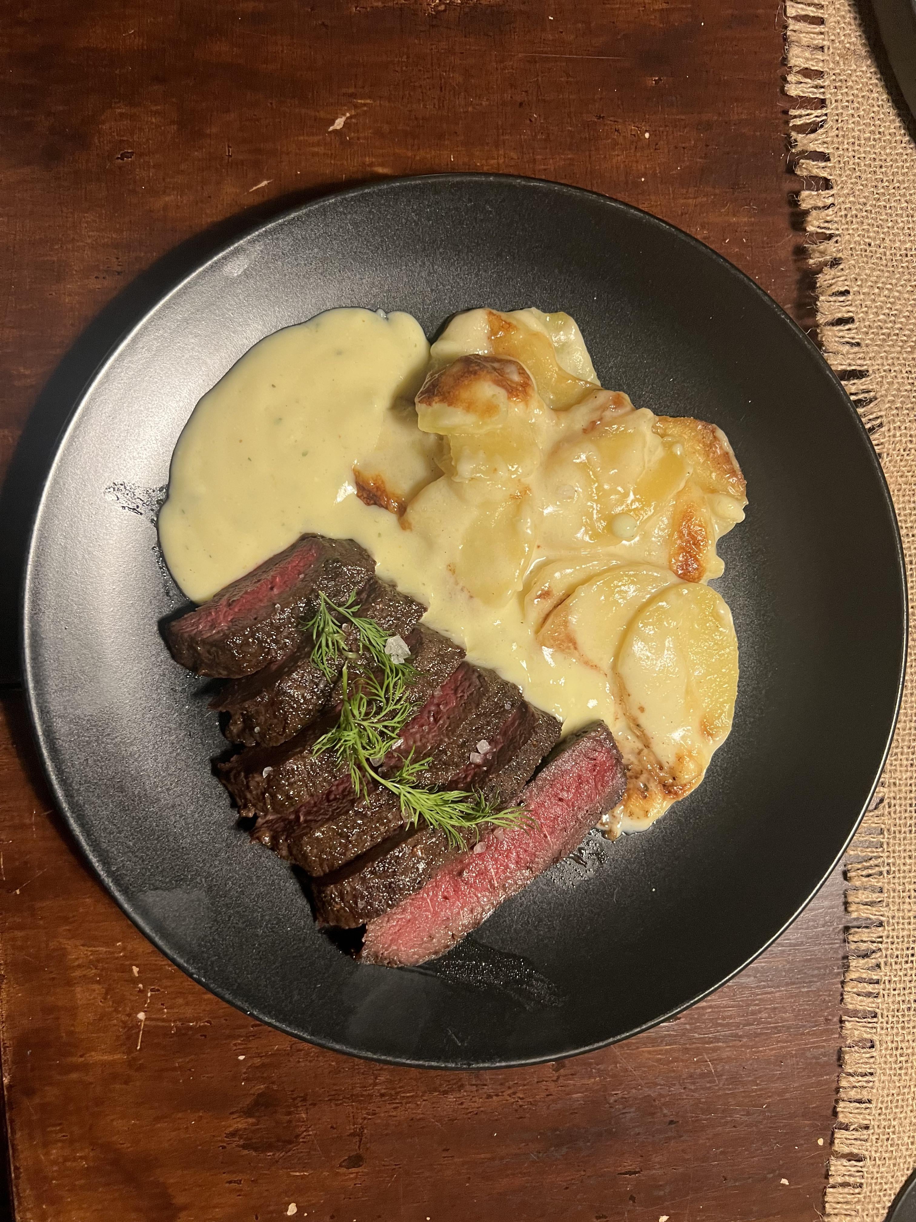 Minke whale marinated in homemade whiskeymarinade alongside with potato-gratin and bearnaise.