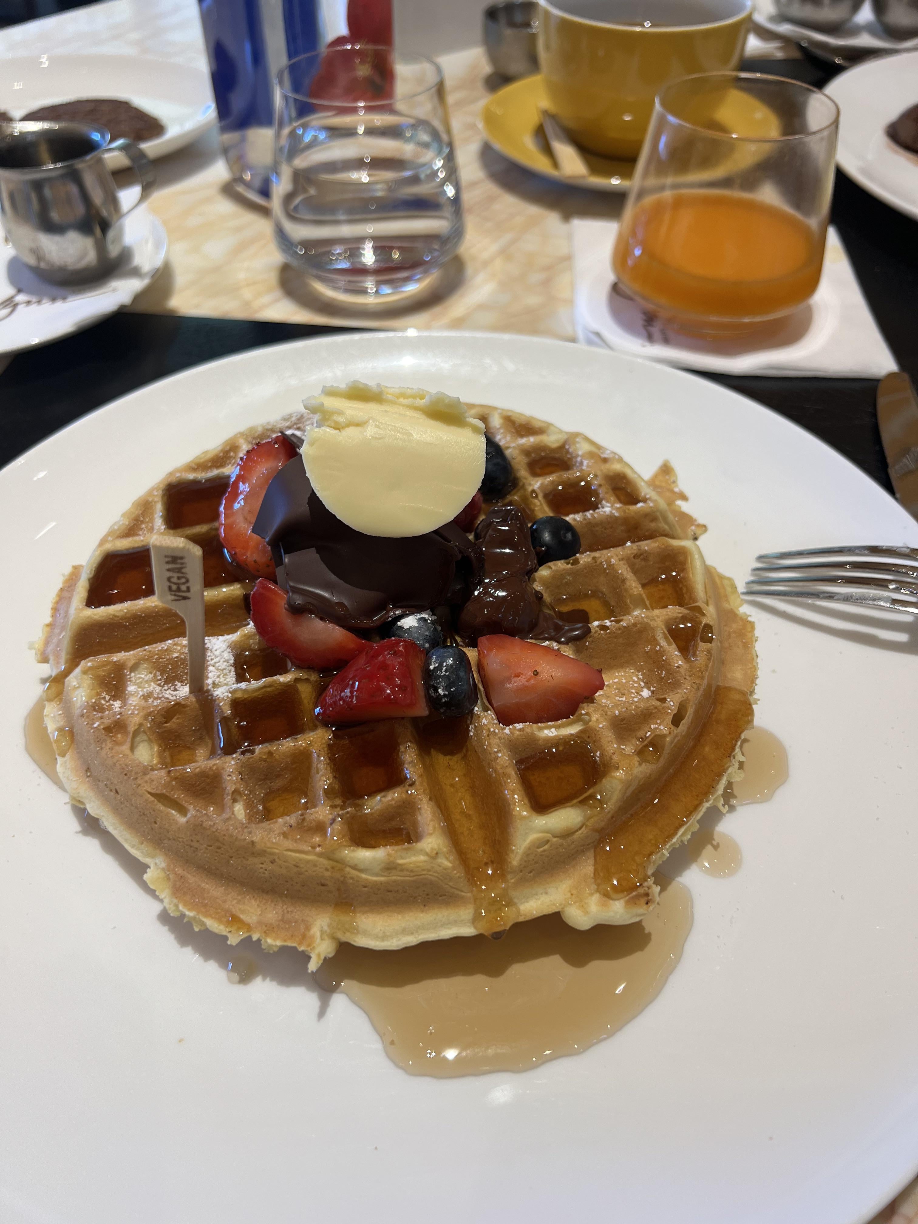For having so many vegan options for many years. This is the vegan waffles with berries and I got a side of impossible sausage on the left by Left_Tree_9505 Vegan Food Vegan Food Porn