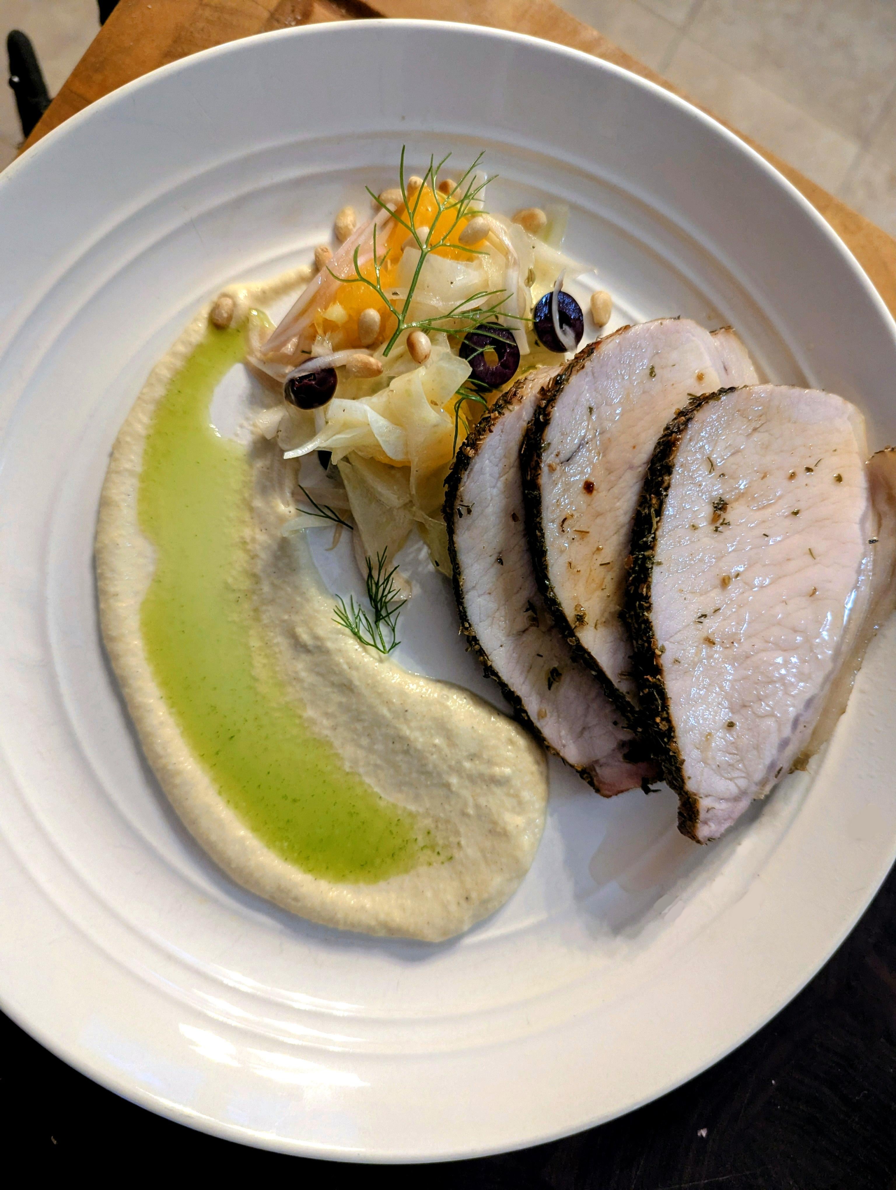 The plate looks great visually. Nice work! That looks like just pork loin to me though and not porchetta…it seems to be missing the pork belly part.