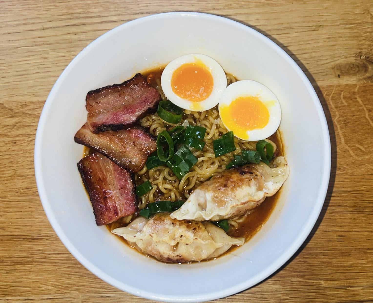 Shin ramyun with porkbelly, buldak dumplings, egg and spring onion