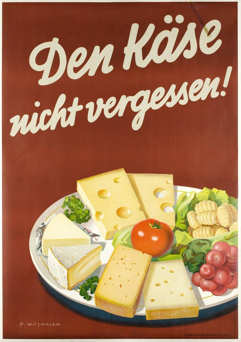 “Don’t forget the cheese!”, Swiss German poster promoting local cheese, made by Fritz Wüthrich and issued by the Swiss Cheese Union, 1951 by Provinz_Wartheland Cheese