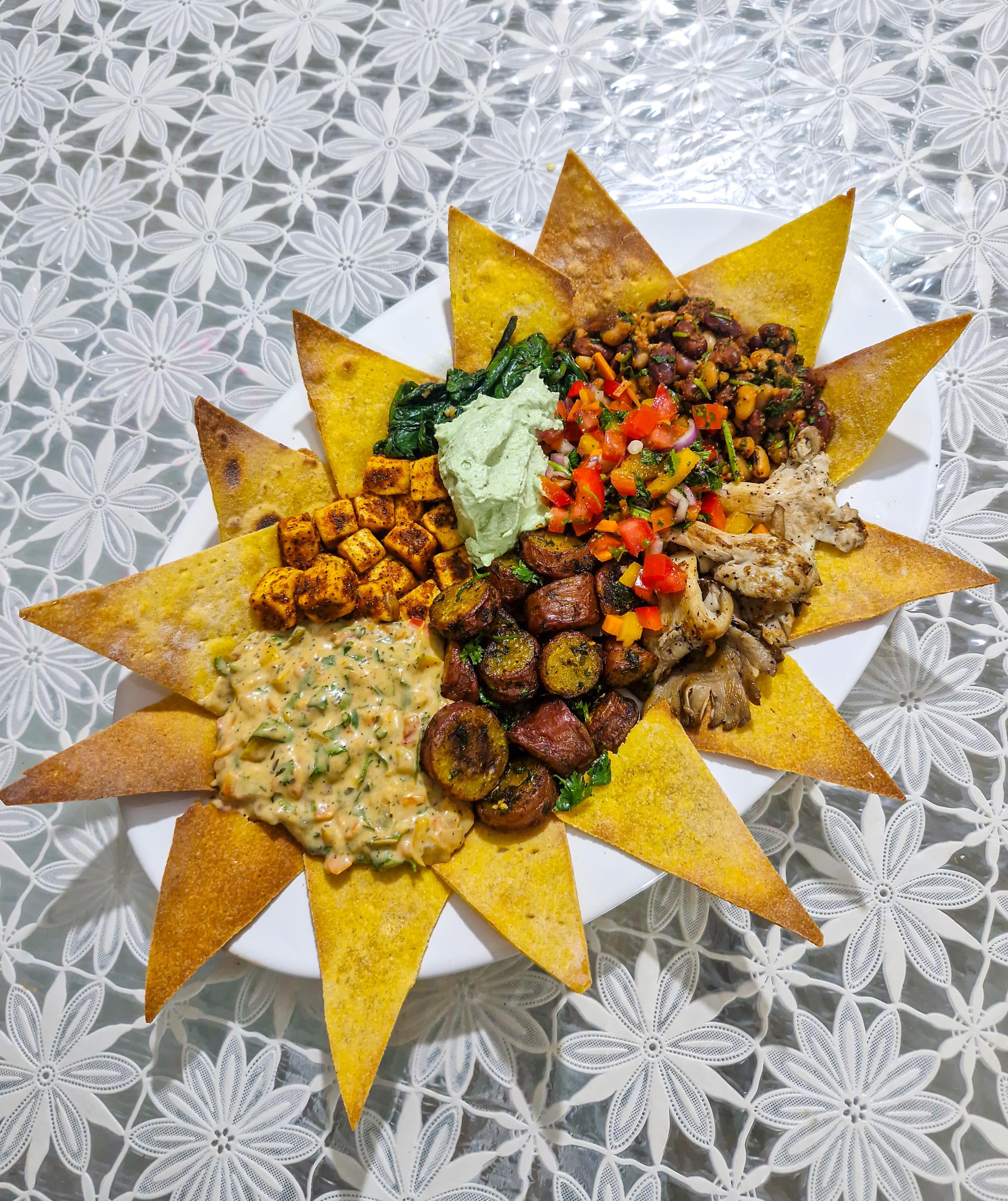 [Homemade] Queso platter with some za’atar roasted sweet potatoes, paneer tikka, refried beans, salsa, mint sour cream and torilla chips.