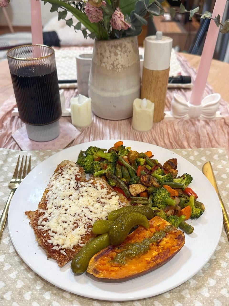 Dinner: cheesy tilapia fillet with roasted veggies and sweet potato all-in-one traybake (277 cals, 36g protein)