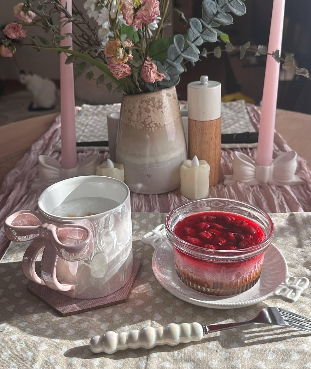 Breakfast: cappuccino, cherry cheesecake (253 cals, 25.4g protein)