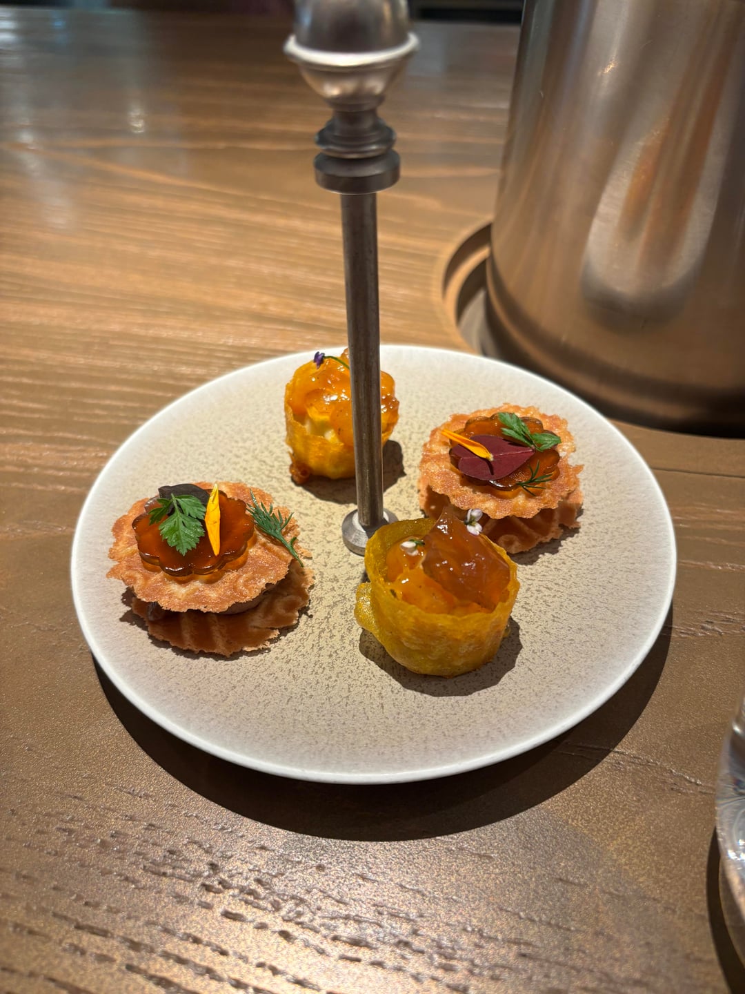 We were presented with some nice bites first, a tartlet with chicken liver mousse and a tartlet with different structures of celeriac