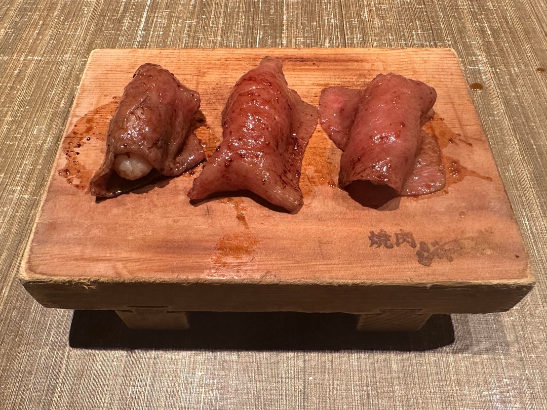 Course: Set course (~10 courses), covers a wide range of beef parts, from classic cuts like tongue and rib to special items like noharayaki (sukiyaki), wagyu nigiri, and Chateaubriand Steak. The staff will grill the meat for you.