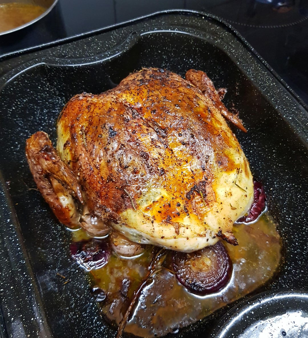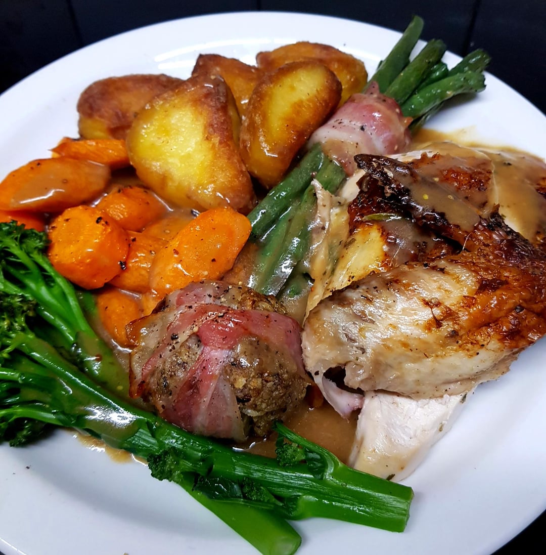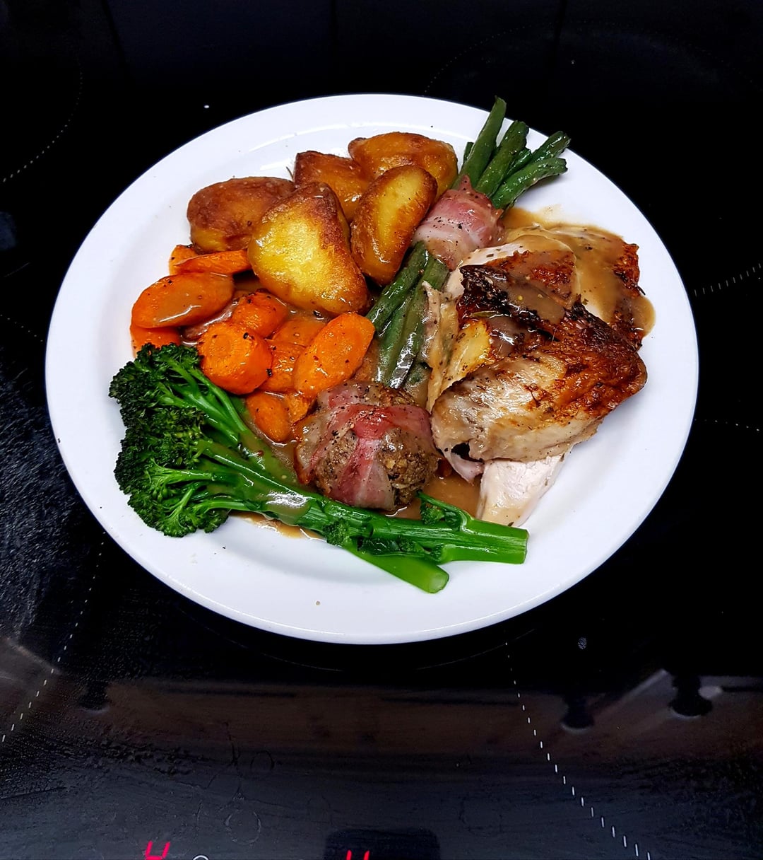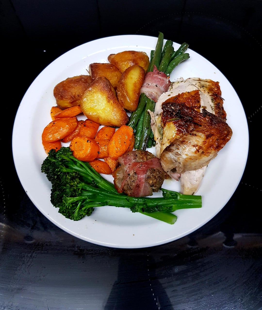 [OC] Stuffed Roast Chicken Crown, Kings Potatoes, Stuffing Ball, Sautéed Tenderstem, Wrapped Roasted Green Beans, Honey Carrots and Wine, Tarragon and Mustard Gravy.