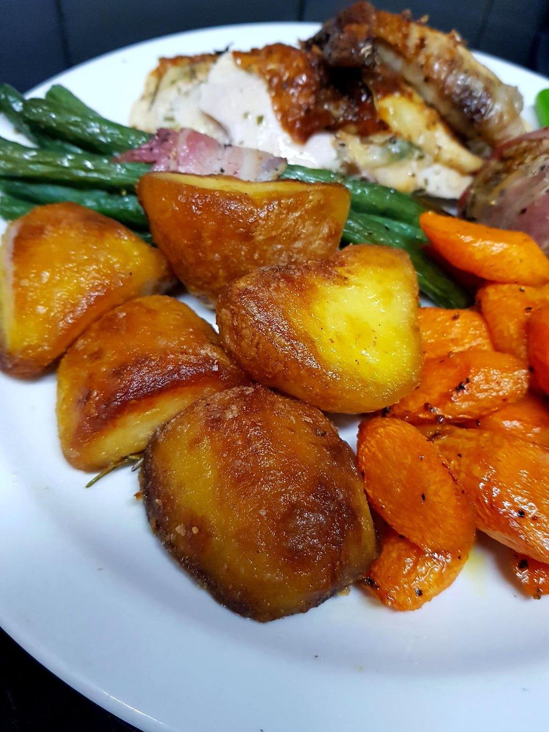 [OC] Stuffed Roast Chicken Crown, Kings Potatoes, Stuffing Ball, Sautéed Tenderstem, Wrapped Roasted Green Beans, Honey Carrots and Wine, Tarragon and Mustard Gravy. by pink_flamingo2003 Dinner Tonight Tonight's Dinner