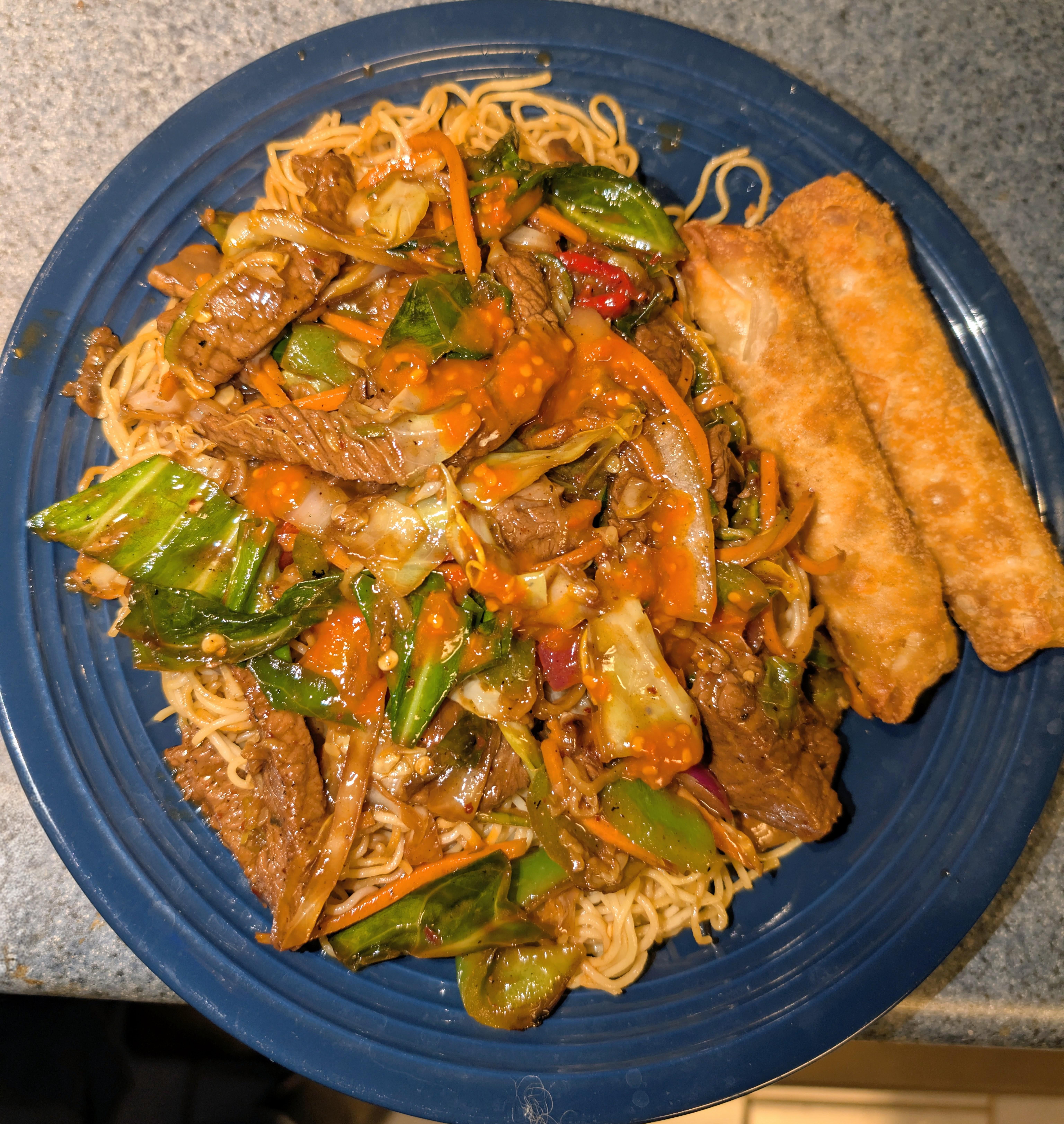 1. Fried vermicelli base, cabbage, bell peppers, jalapenos, onions, zucchini and squash noodles, carrots, mushrooms, and marinated top sirloin. Once completed combined in large pot with House of Tsang Szechuan sauce. My plate was topped off with Trader Joe’s Birds eye chili hot sauce and a bit of soy sauce.