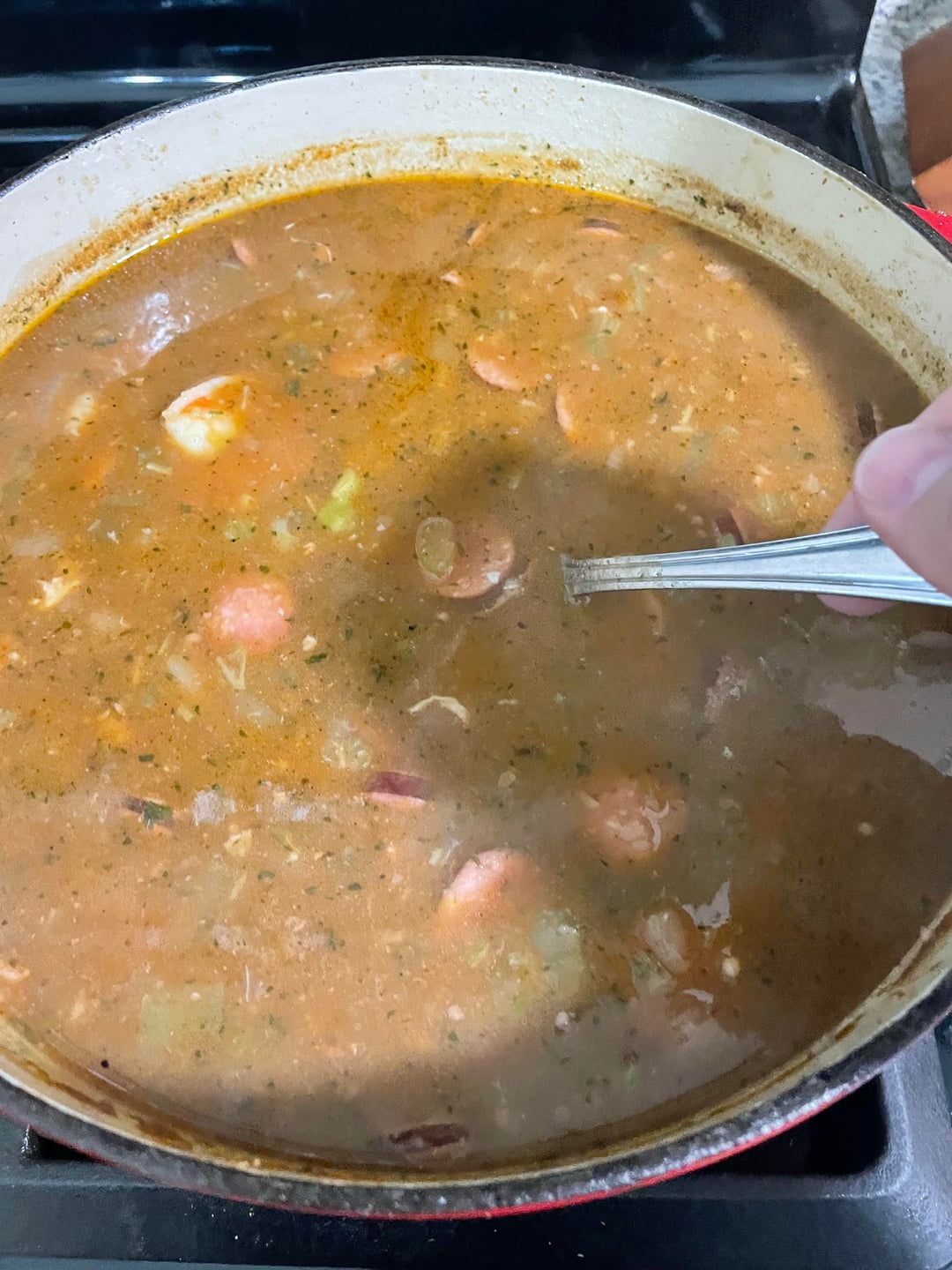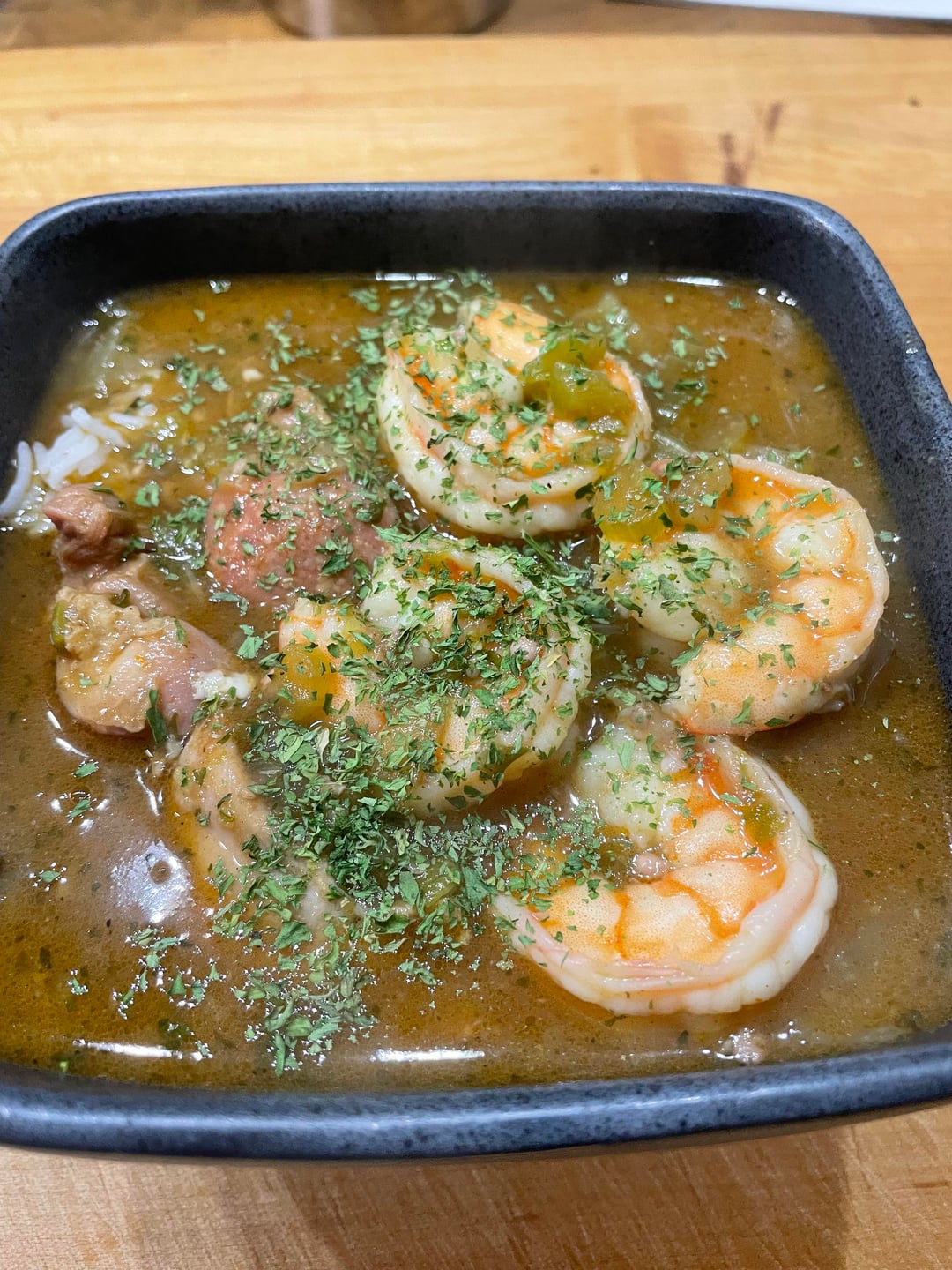 – once thickened add shrimp to the pot.. you can likely kill the heat to the gumbo and let the residual heat cook the shrimp (jumbo… peeled and deveined) through.