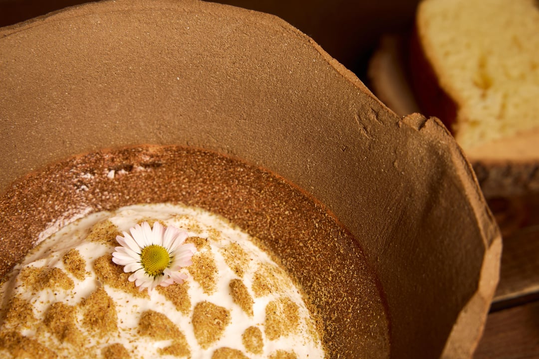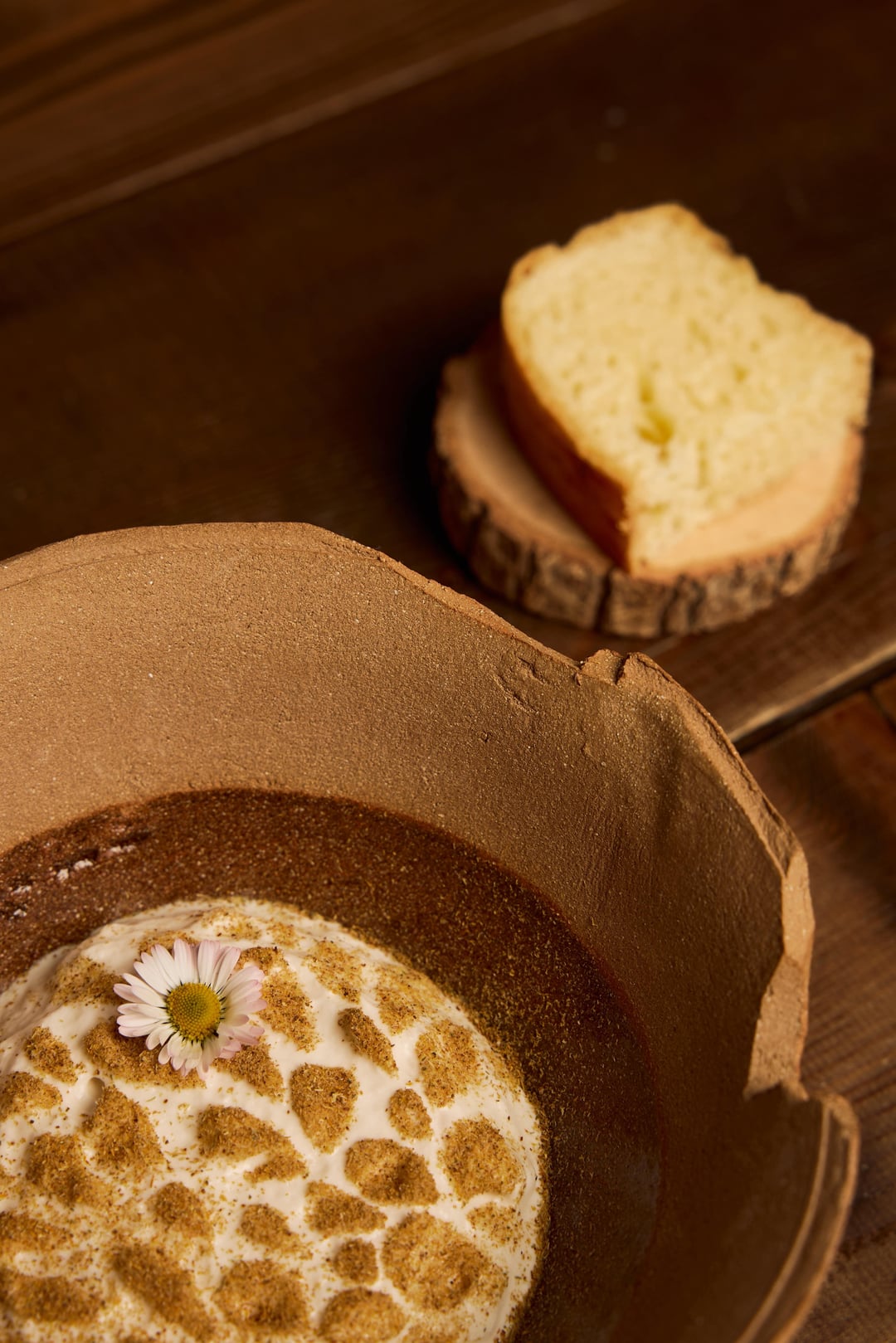 Pan brioche with Tuscan honey, Tuscan barley malt, calendula flowers, goat cheese ice cream, pollen garum