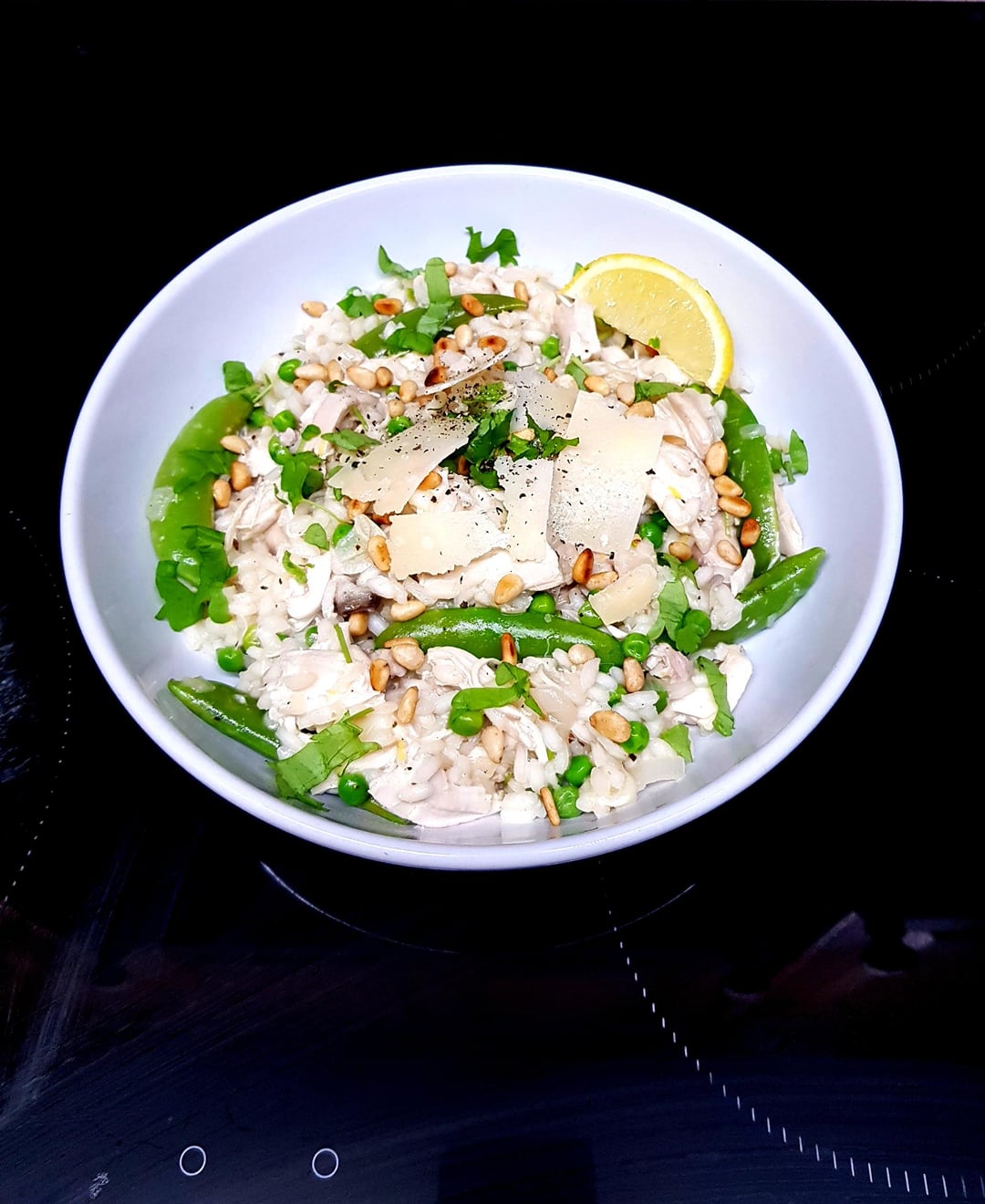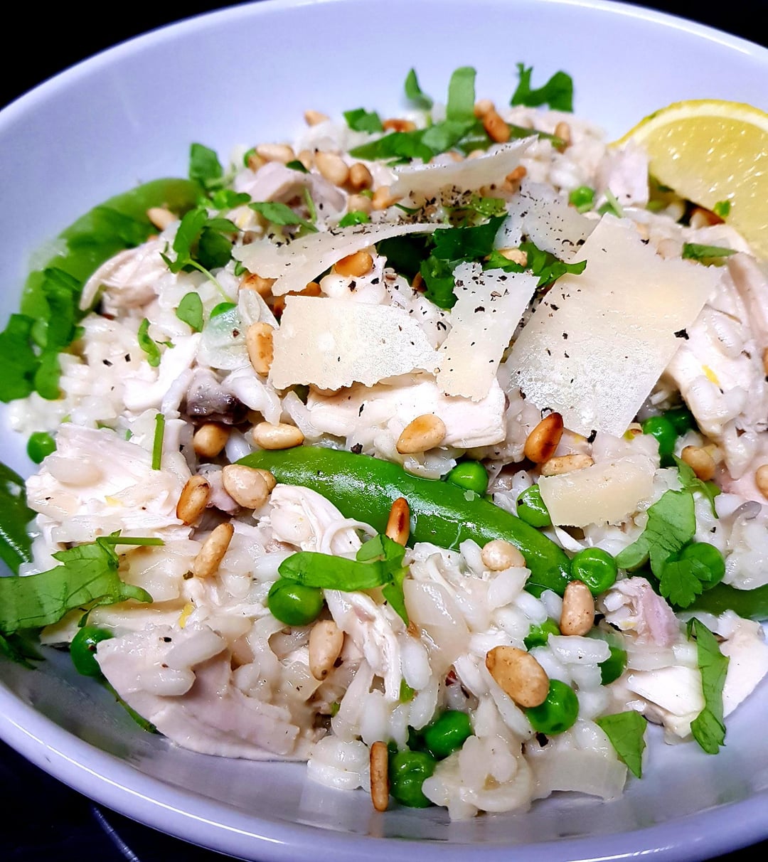[OC] Chicken Risotto with Peas, Snap Peas and Pine Nuts. Finished with a Little Parm and Lemon. by pink_flamingo2003 Dinner Tonight Tonight's Dinner